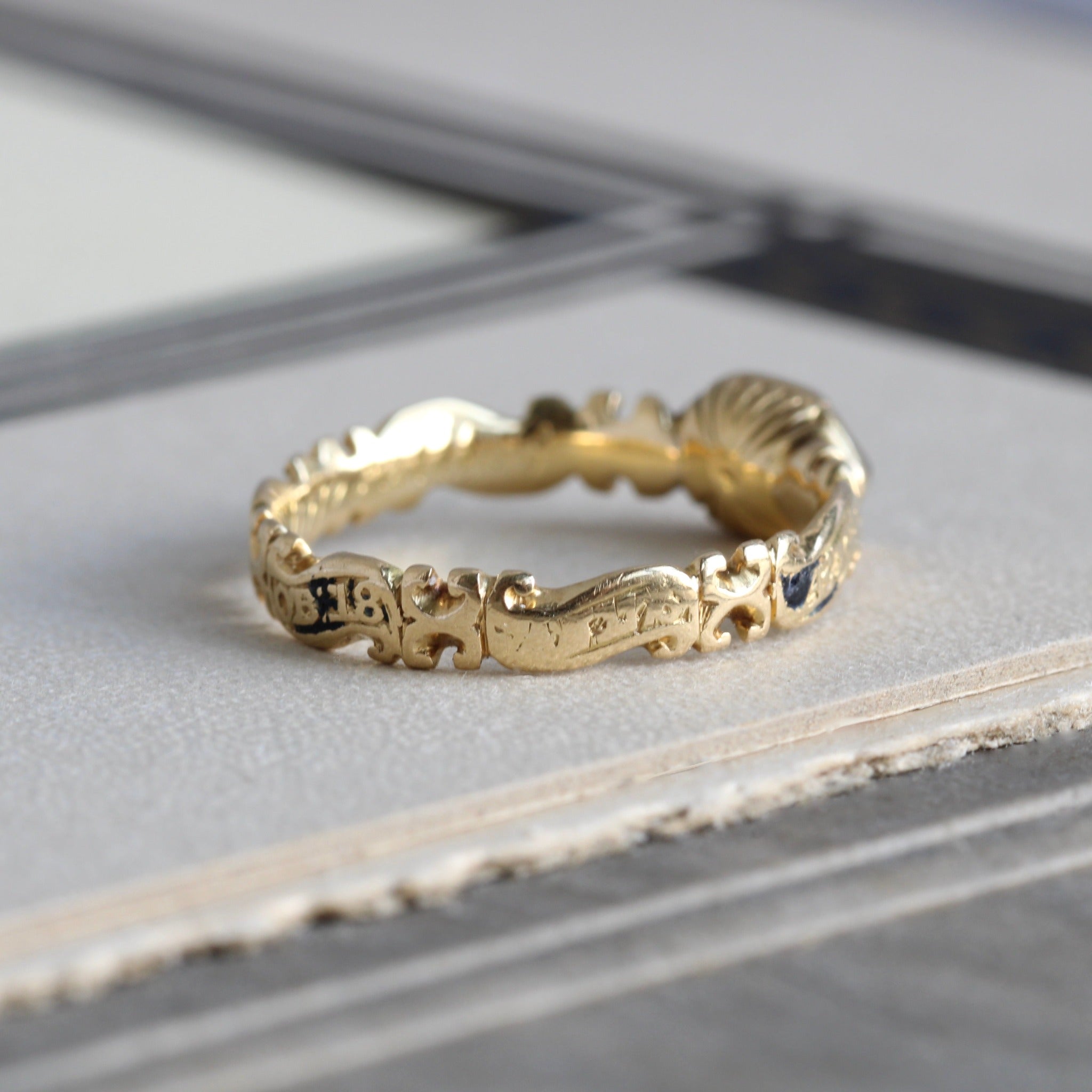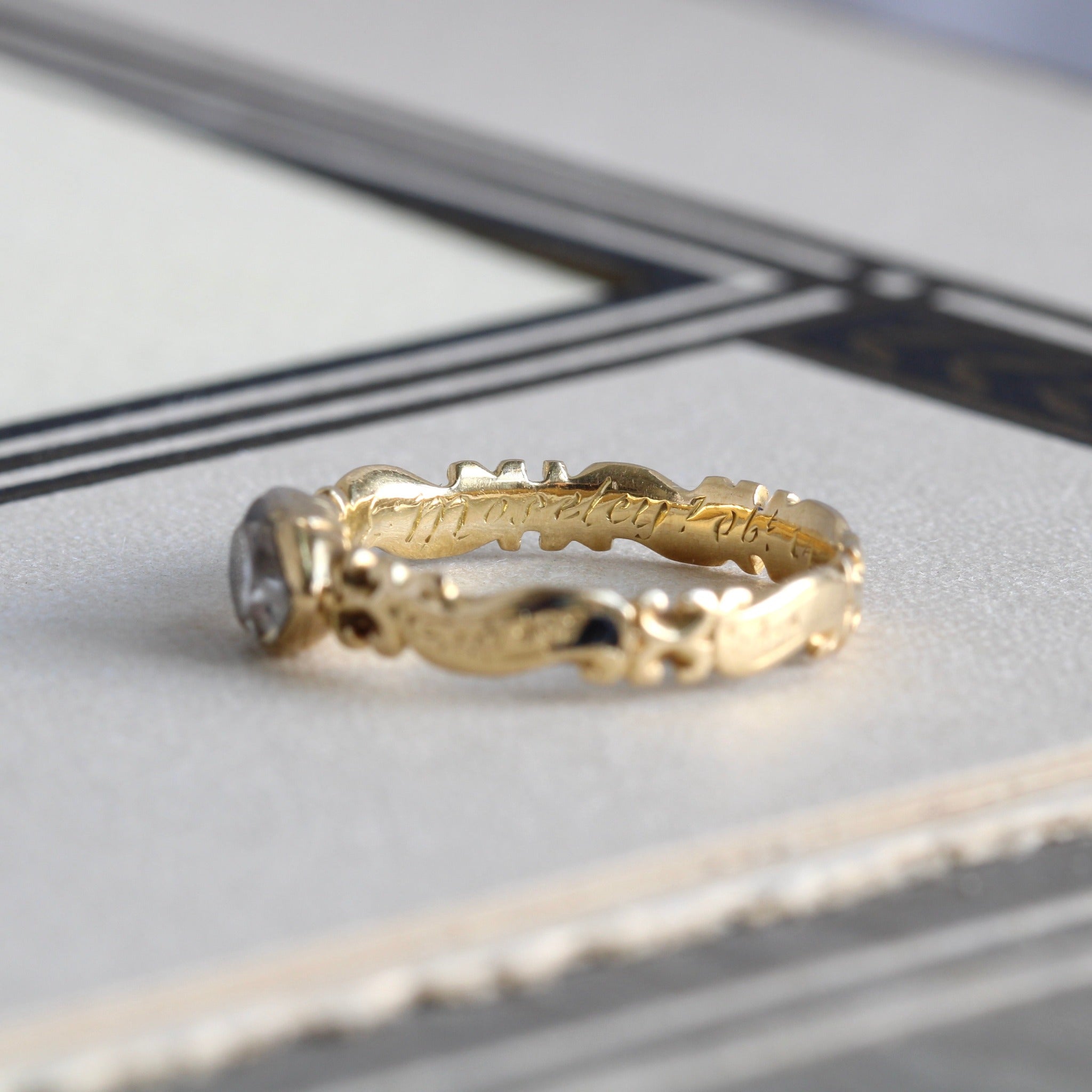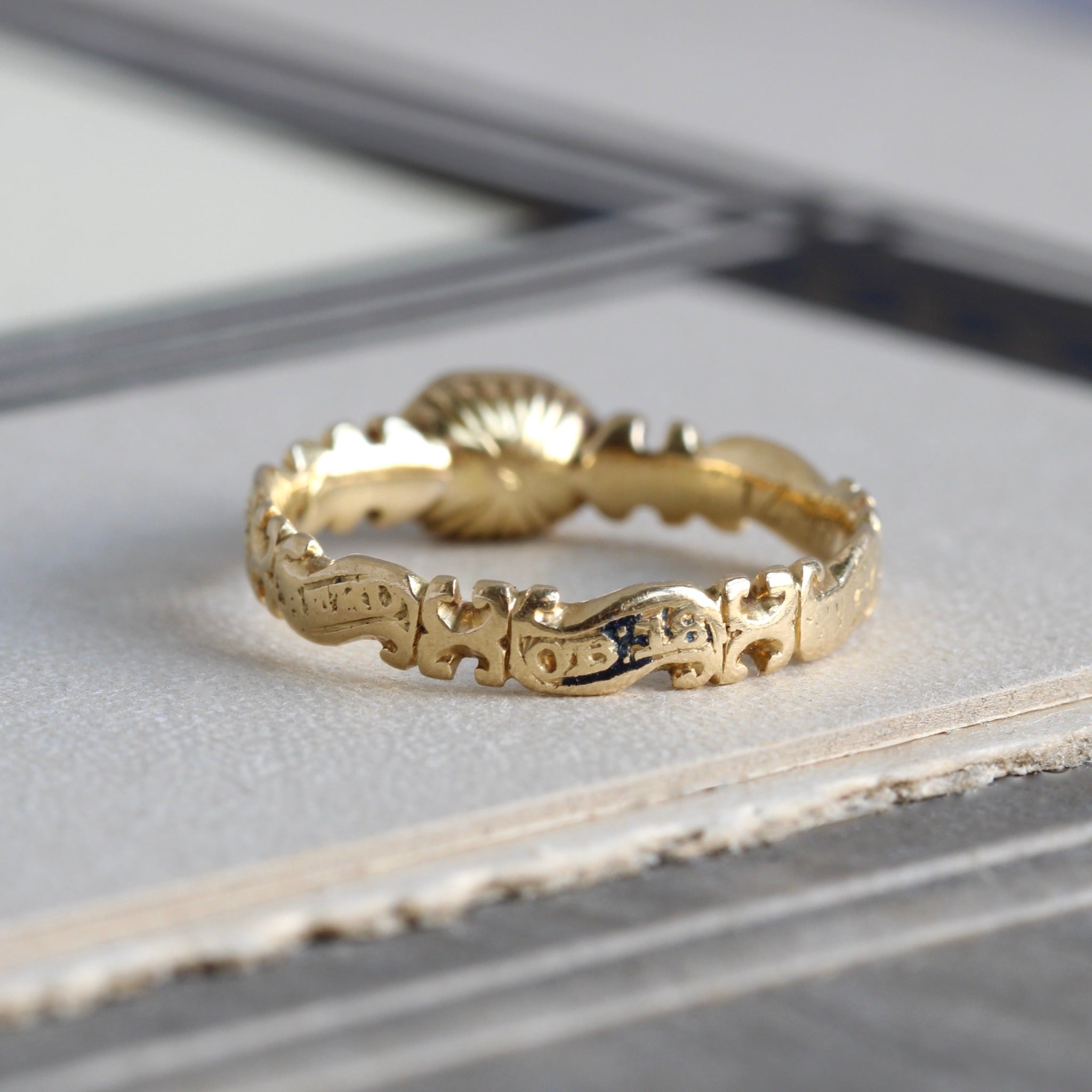 The original details of the outer band have been burnished smooth over the last 280 years of service, with only remnants of letters and some of the original black enamel, however the interior engraving is relatively legible: 'Moseley ob 14 Aug 1742 : ae : 71'