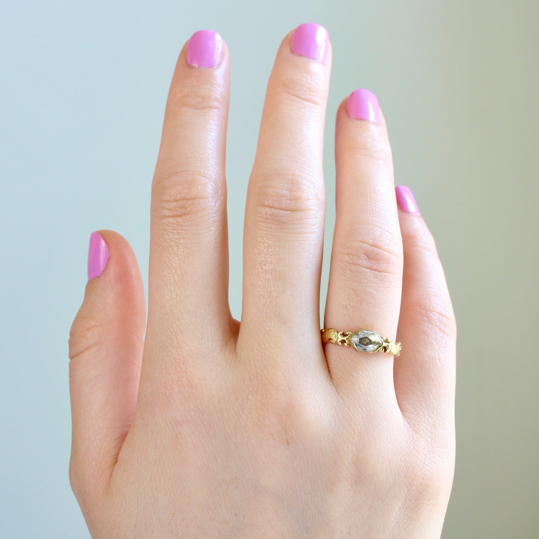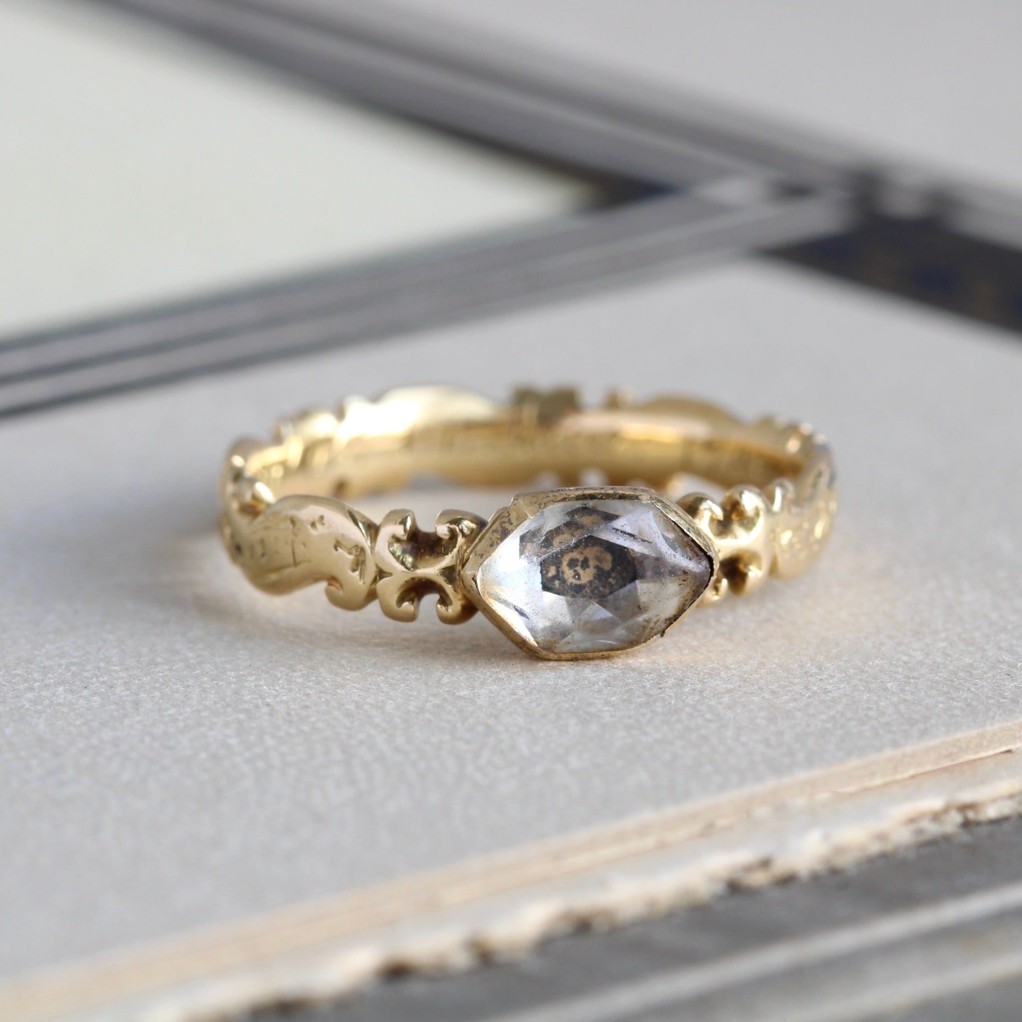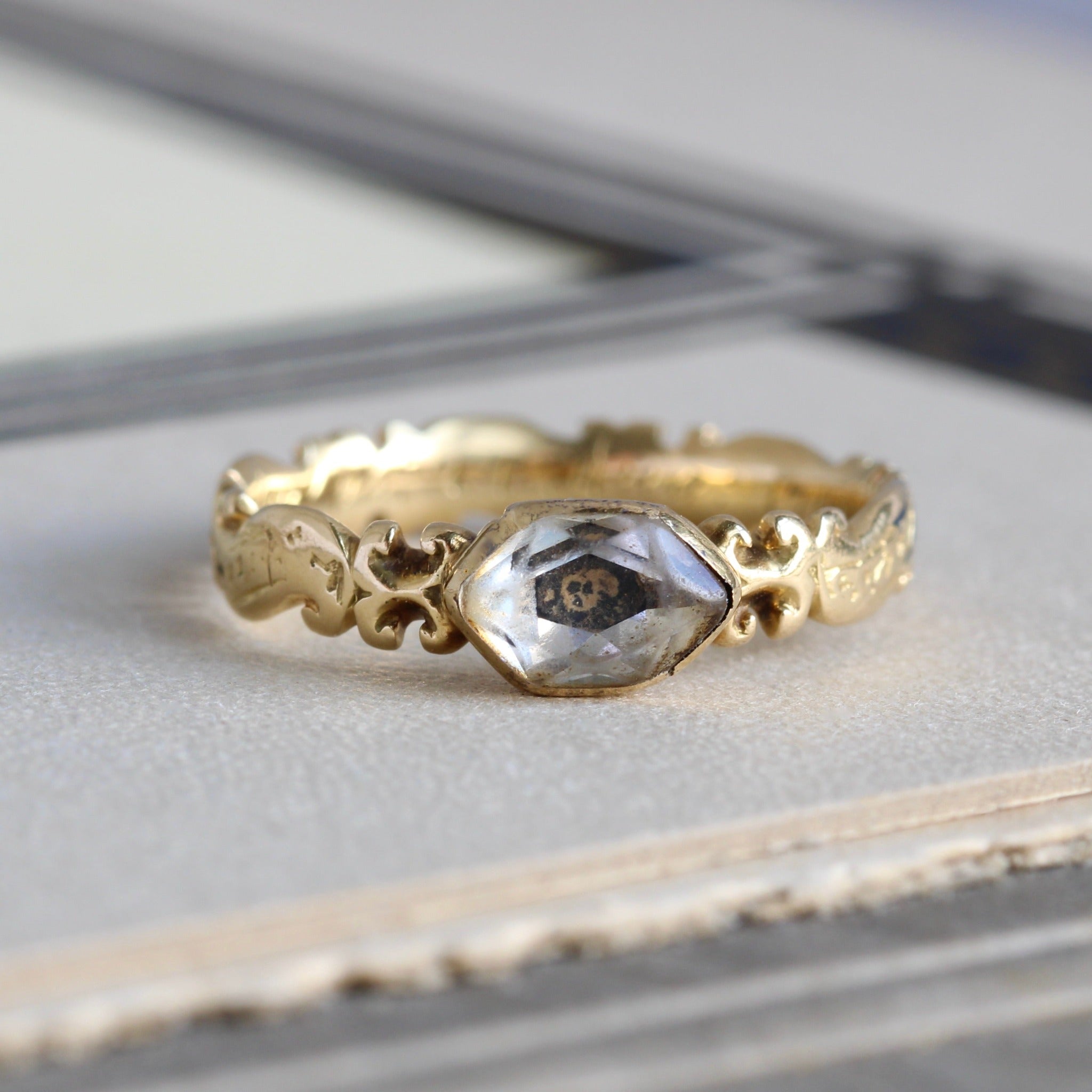 Condition: In wearable condition with advanced softening to the details of the outer band and light frosting on the rock crystal face, but no damage to the ring's structural integrity.