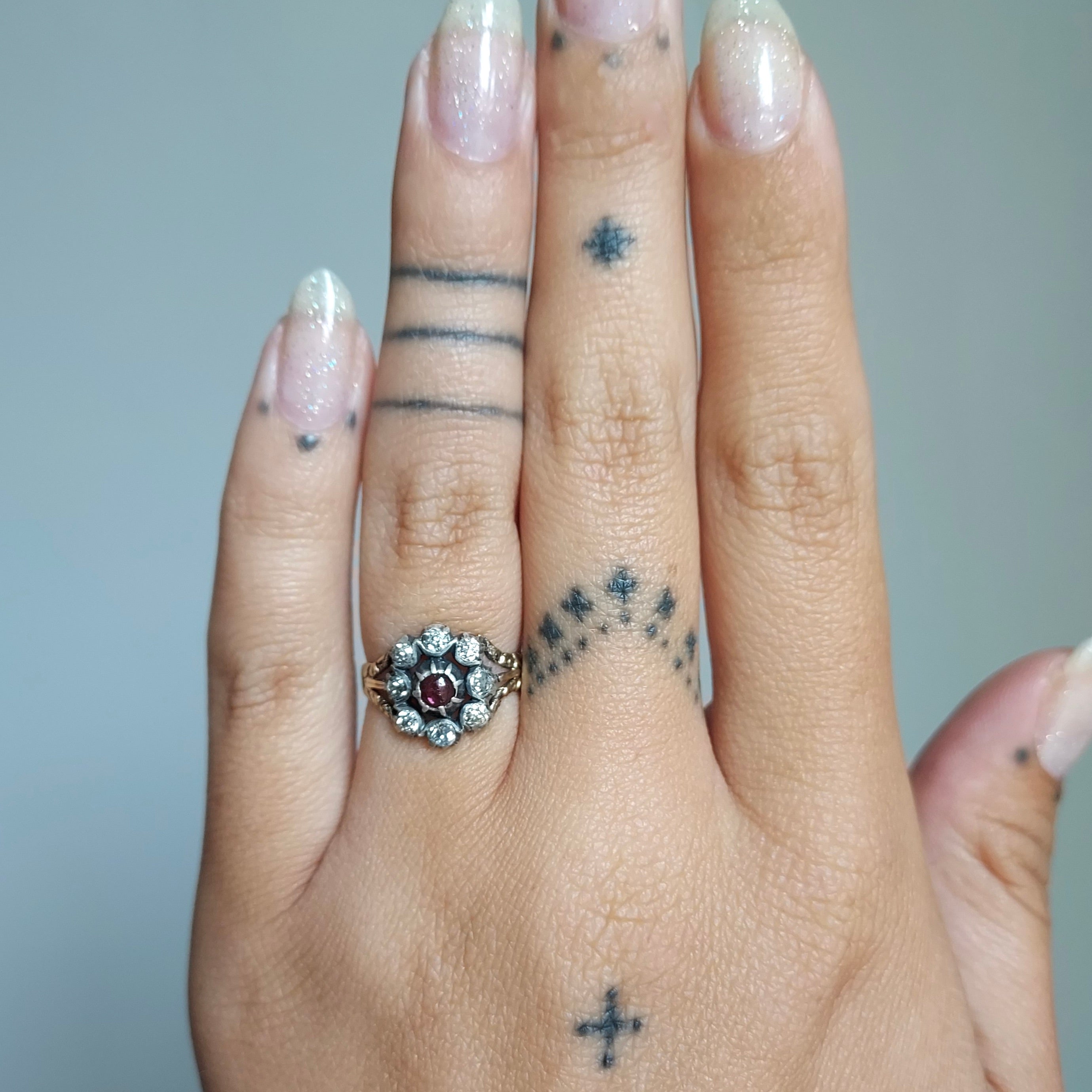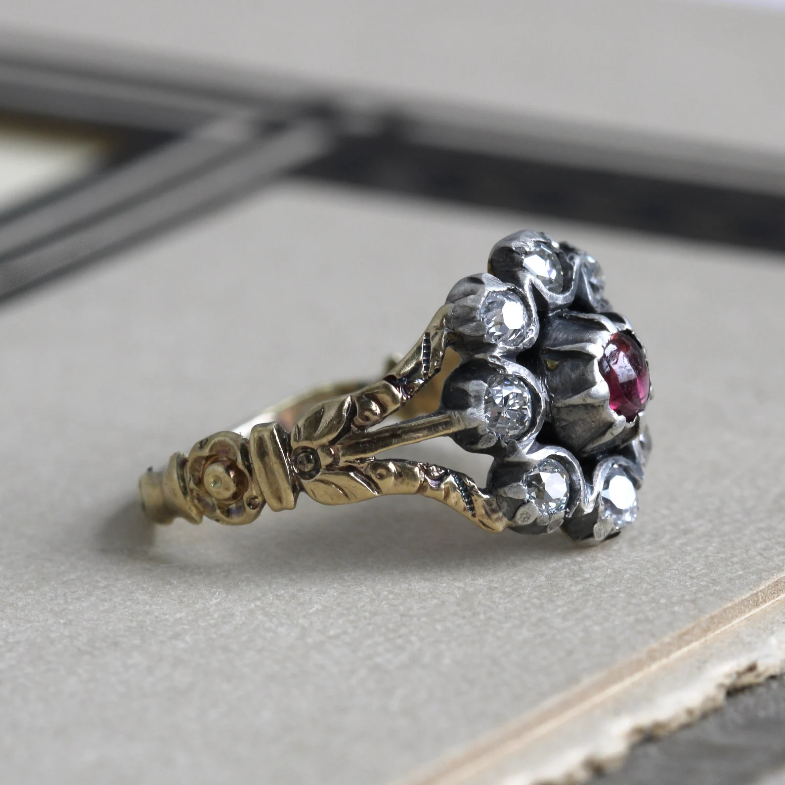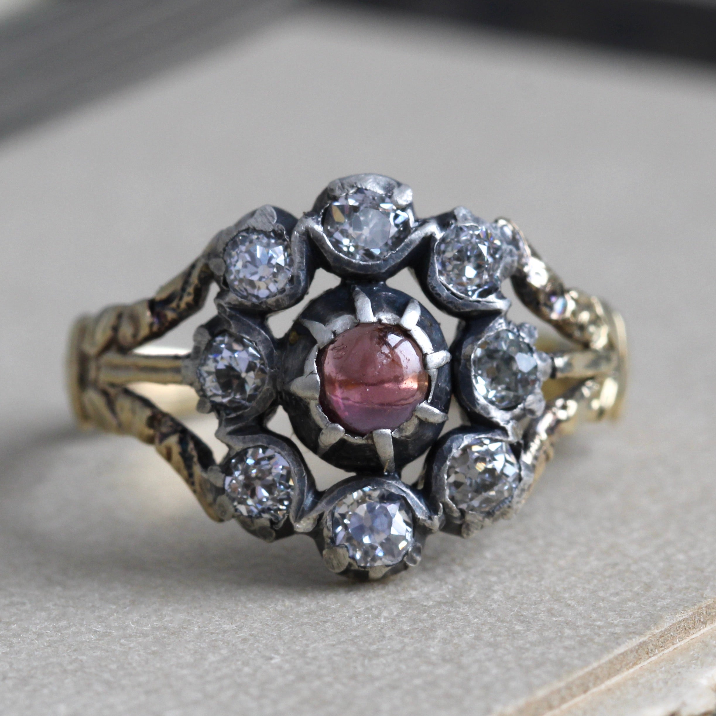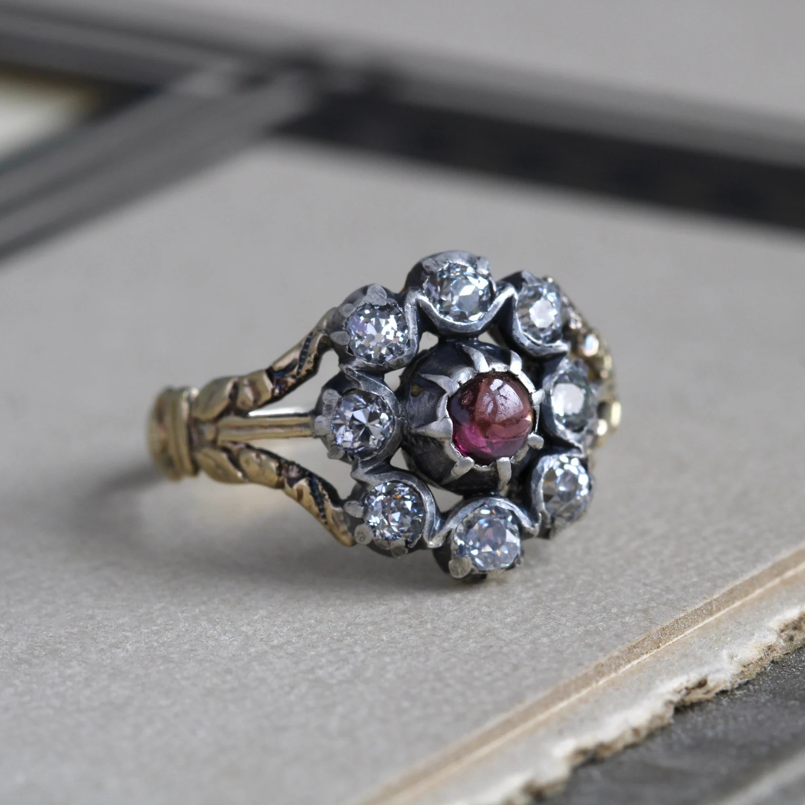 A charming early 19th century ring in exquisite condition, circa 1820 crafted with a 14k gold hoop and open-backed cut-down collet settings in sterling silver for the glittering bright old mine-cut diamonds, arranged in a flower petal halo around a merlot-red garnet cabochon.