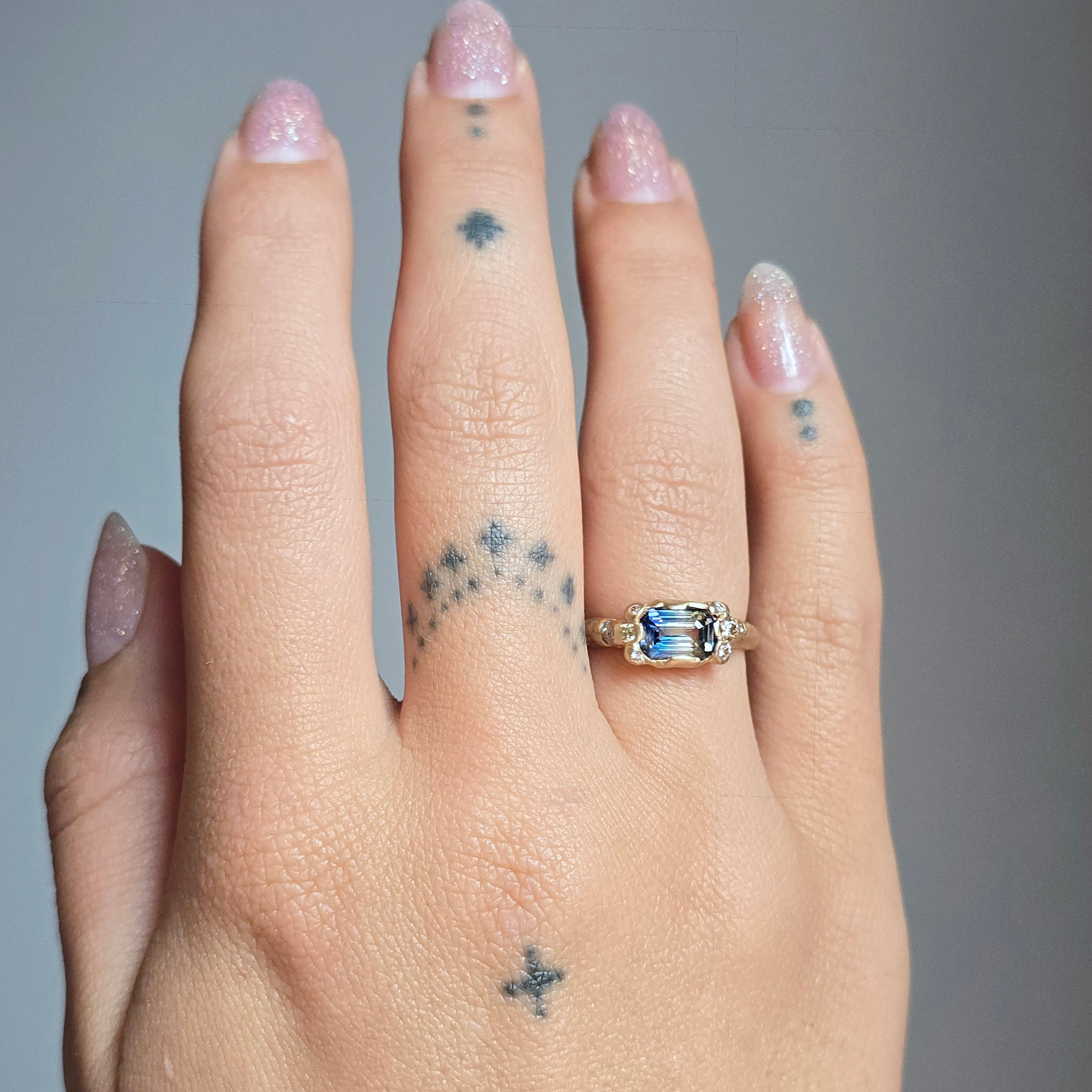 We've used accents of gently tinted diamonds to compliment this fascinating display, in our signature organic molten-gold style setting.