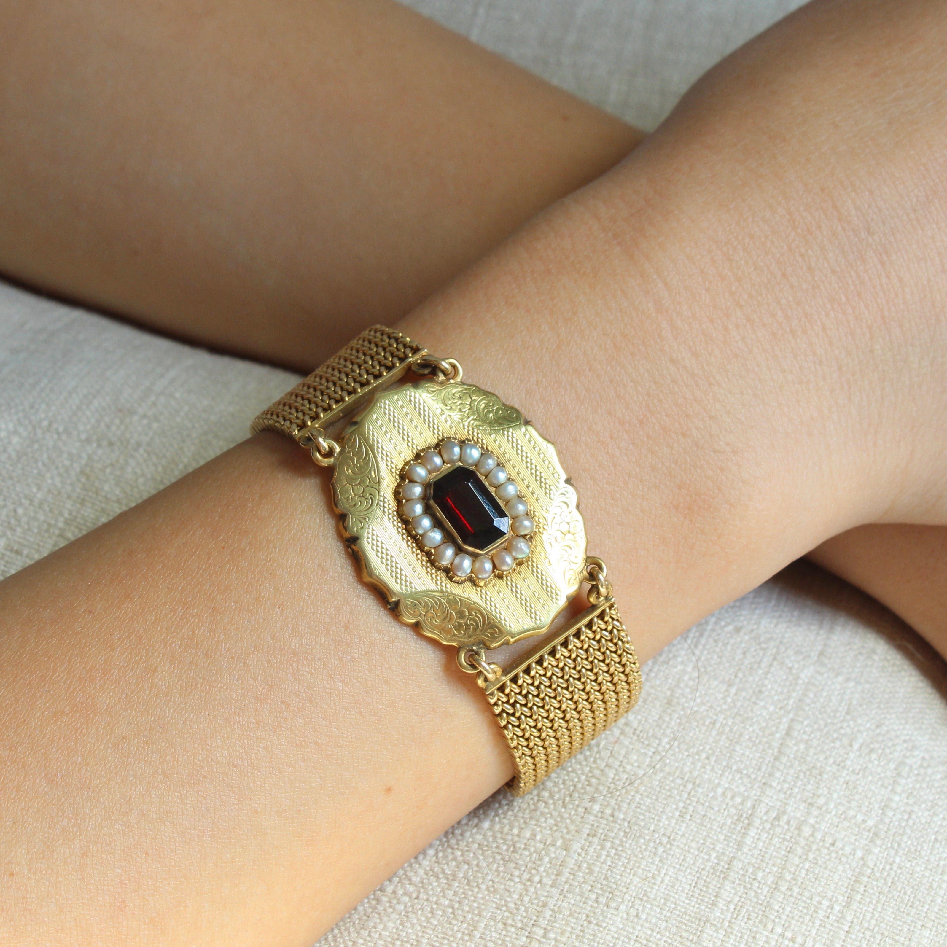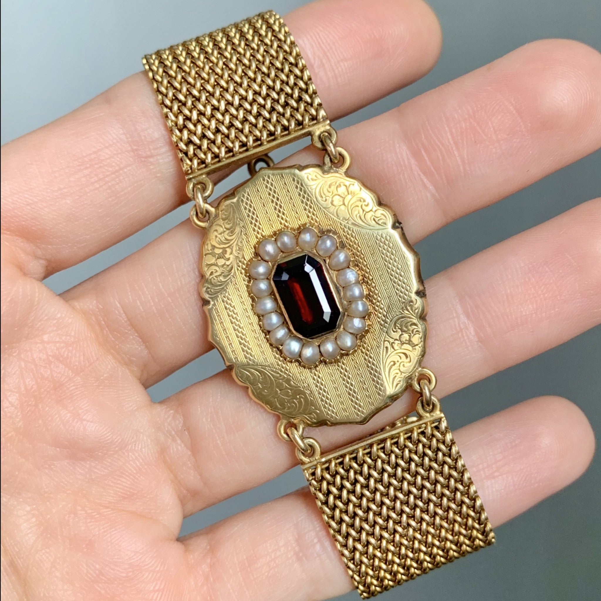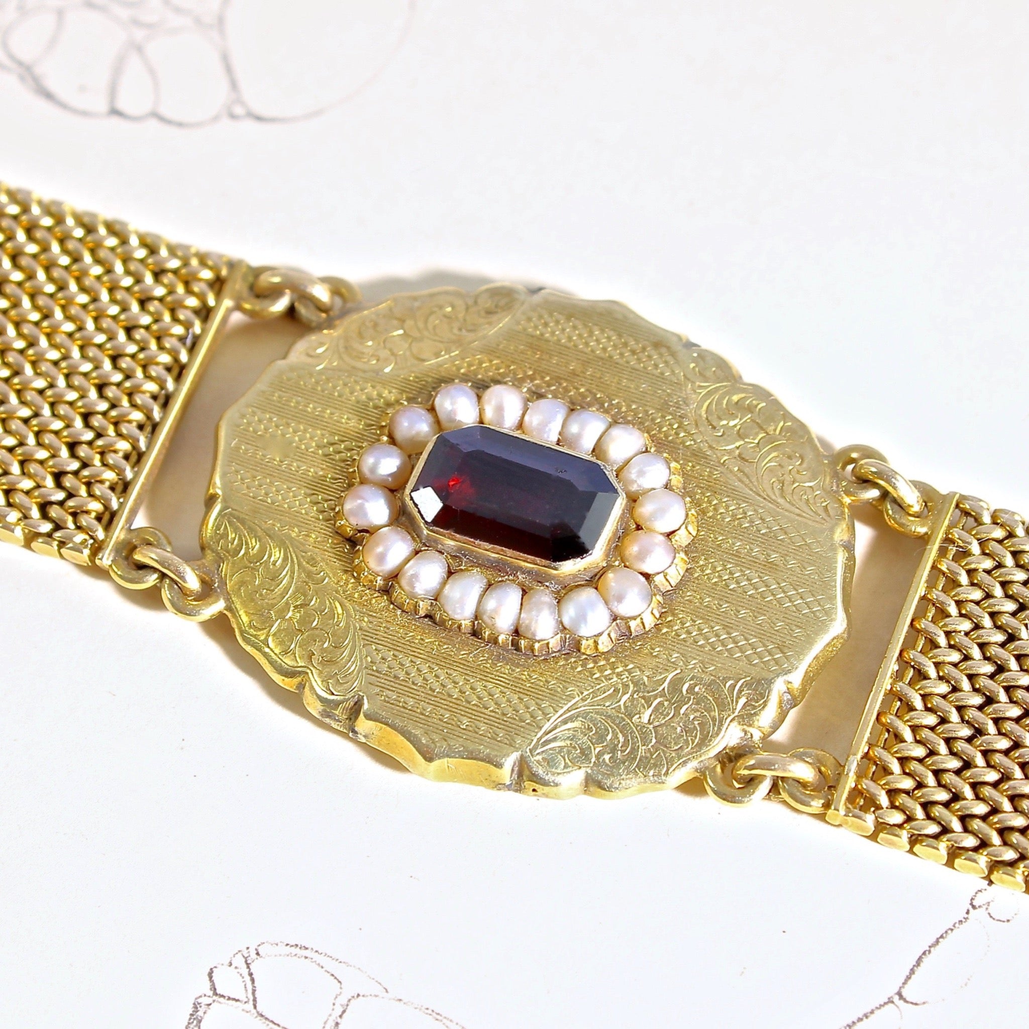 Crafted in 14k yellow gold featuring a velvety-red emerald-cut almandine garnet surrounded by natural seed pearls as the focal point of the center plaque. The mesh band is flexible and makes the bracelet fit very comfortably on the wrist.