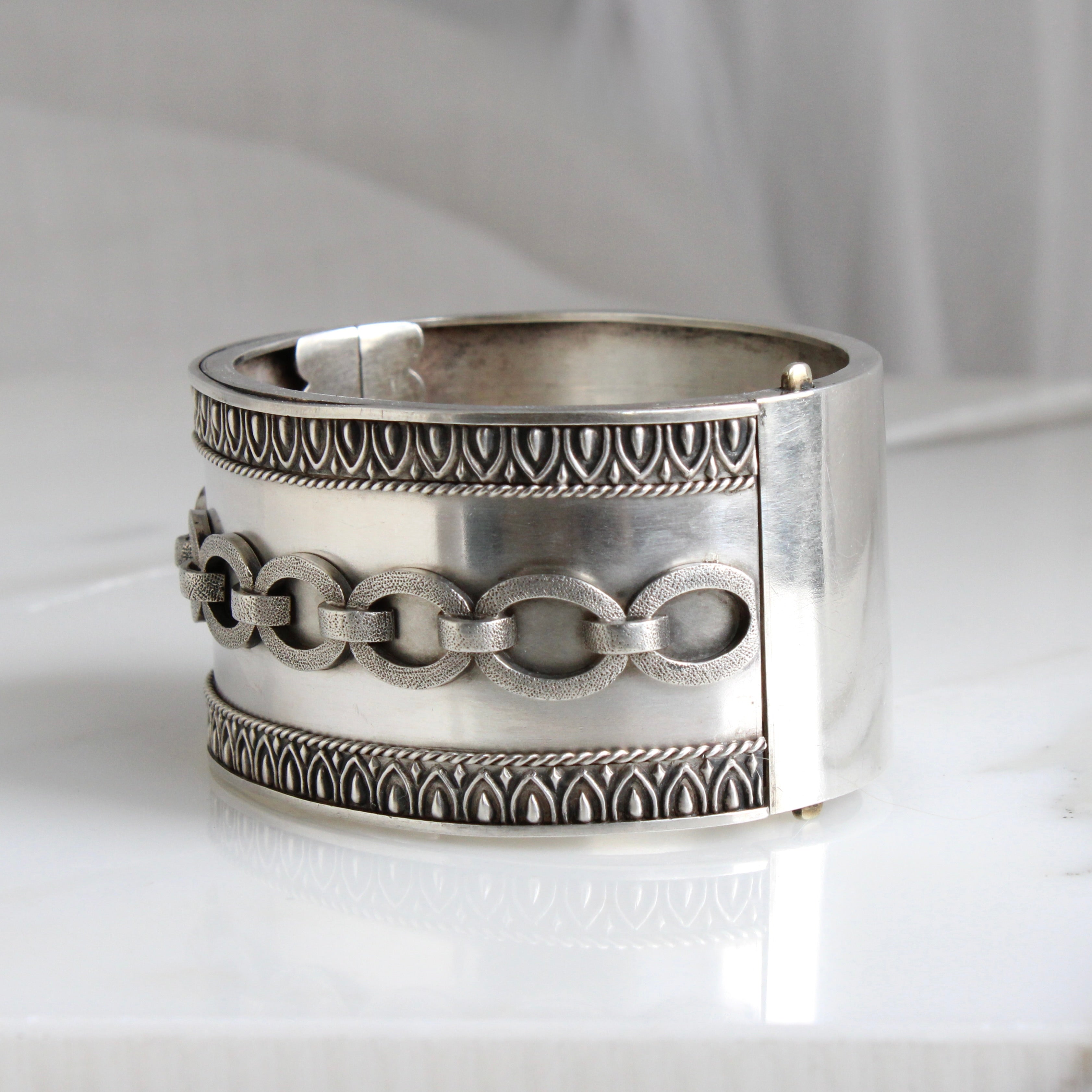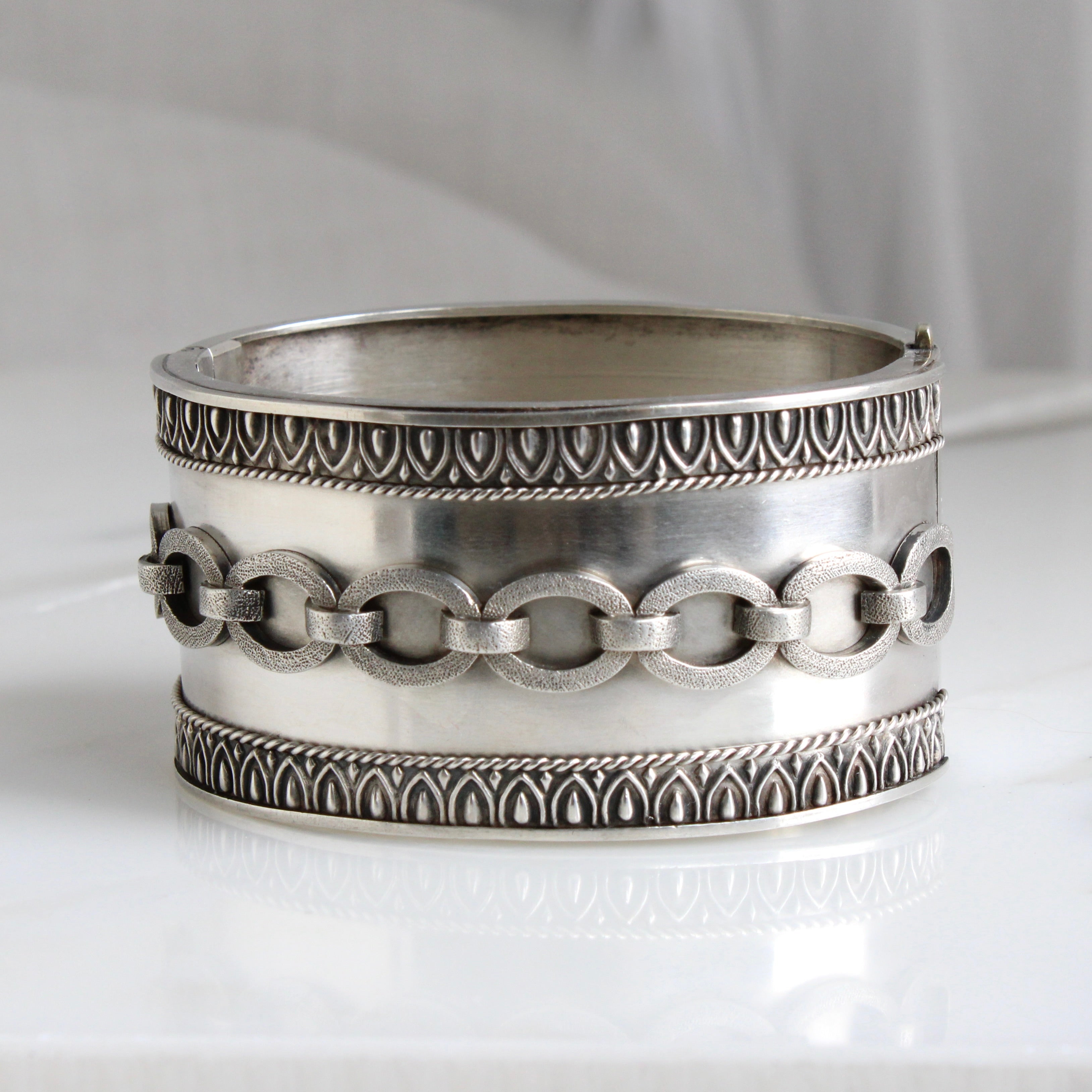 A wide Victorian bangle bracelet crafted in sterling silver with a chain link motif across the front, the bold graphic design adds an edge to the sweetness of the richly chased border. Victorian society was famously obsessed with all things symbolic and chain bracelets were often worn to reference the strength and bond of true love.