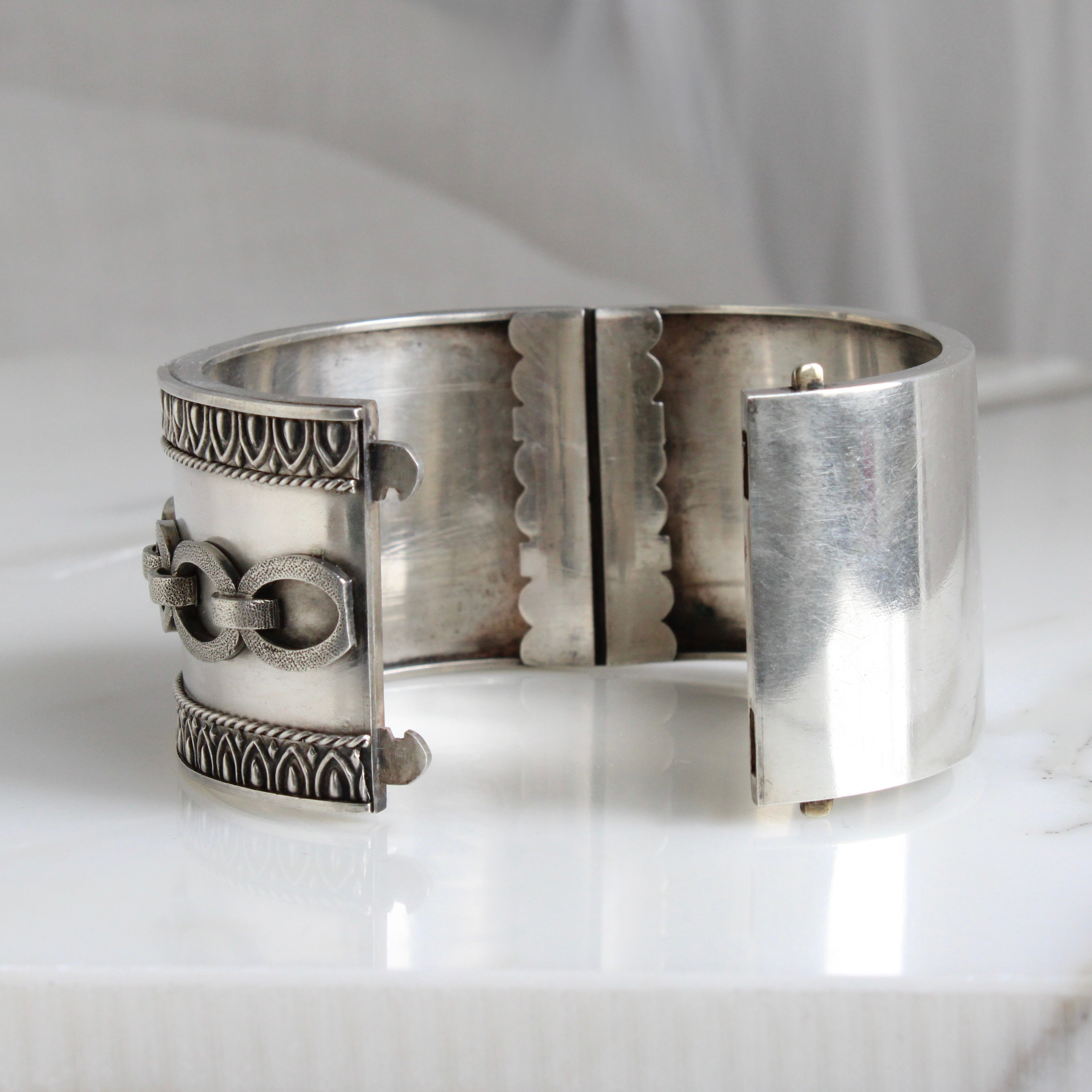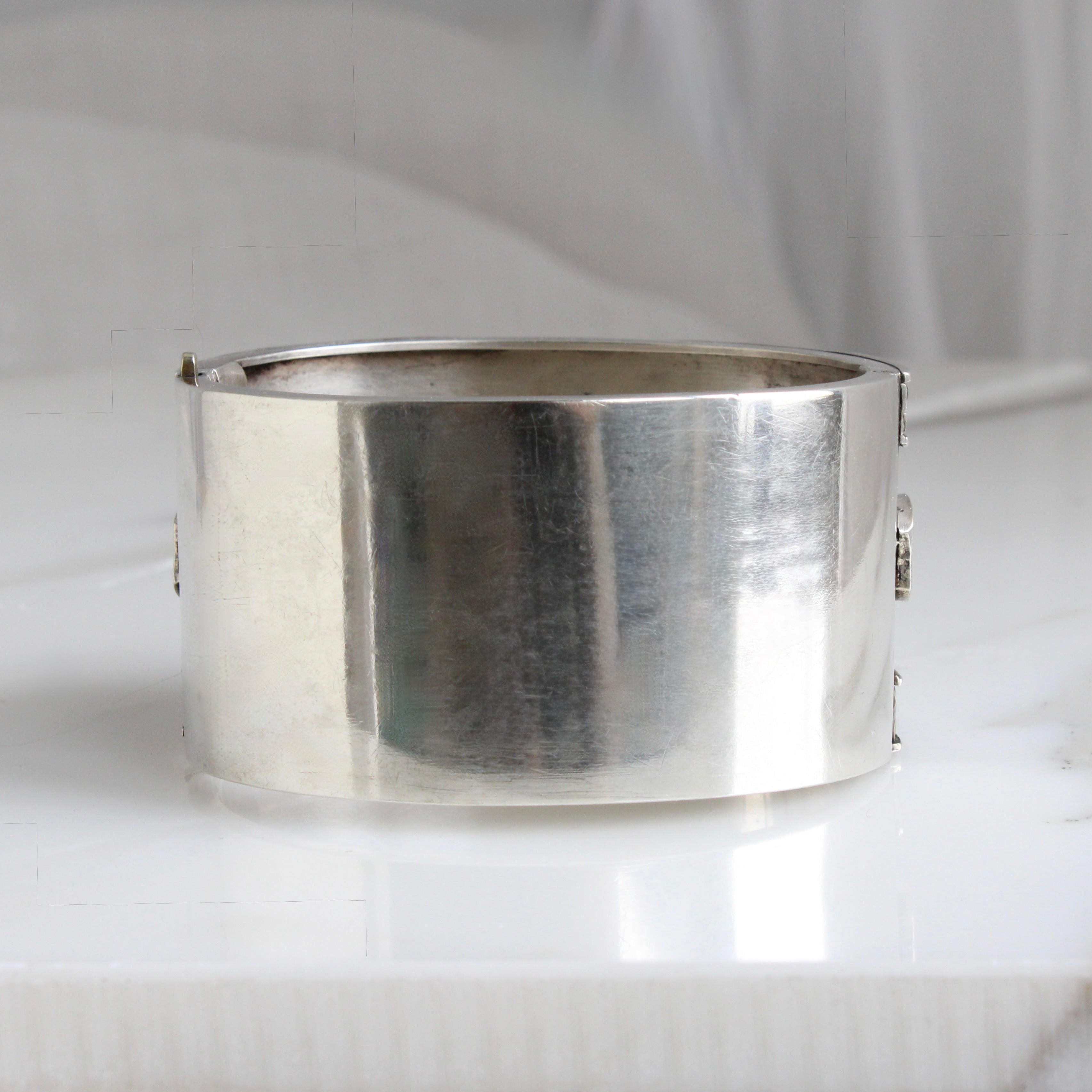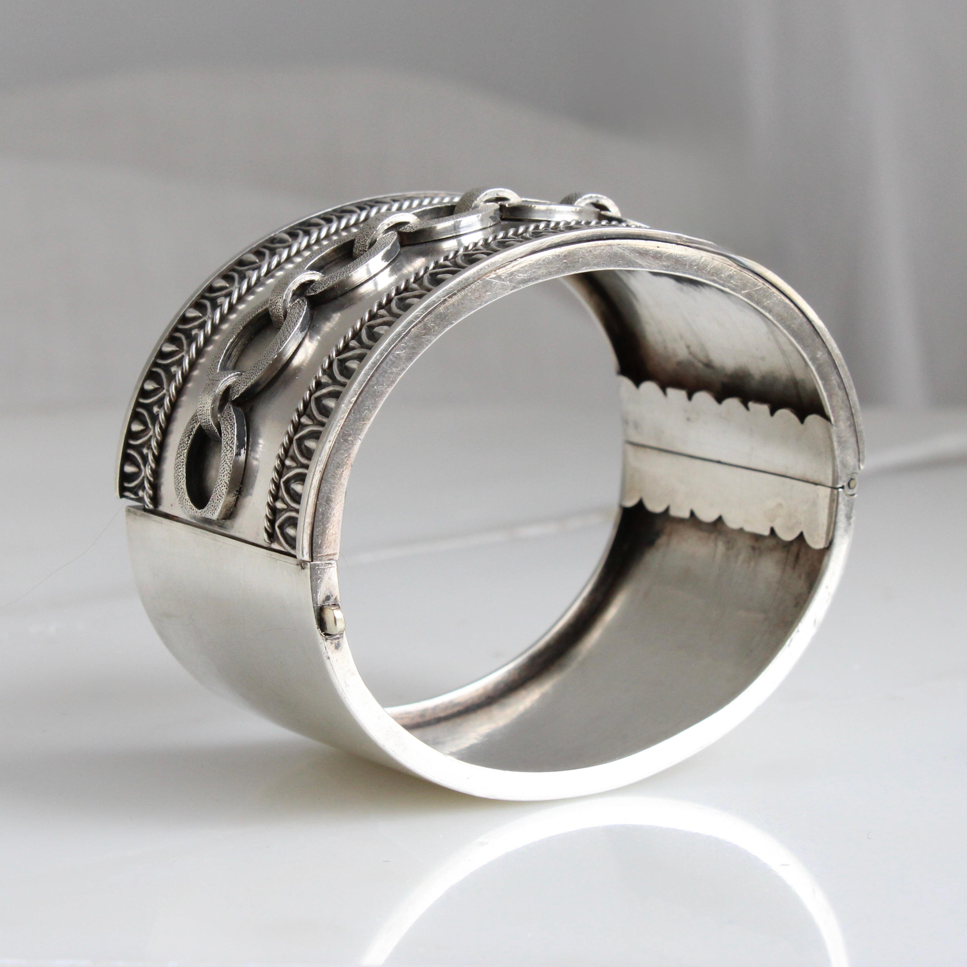 Condition: In excellent condition with a rich antique patina on the outside, and inside but no obvious dents or scratches to mar the surface. Both hinge and clasp are in good working order and the bracelet stays safely shut when clasped.