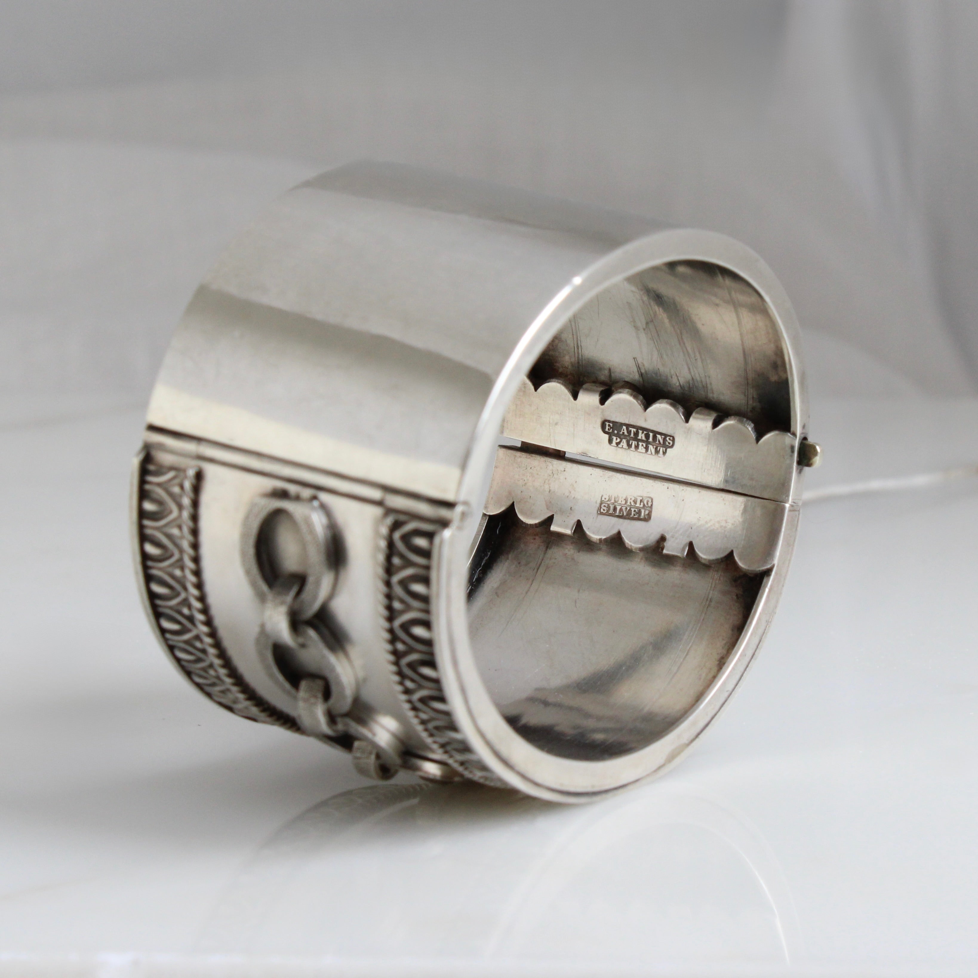 Details: An oval shape approximately 1 3/8" wide, and 2 1/4" by 1 7/8” across the inside diameter with an interior circumference of approximately 6 3/8". Hallmarked on the inside  for sterling silver with the manufacturing jeweler's name R. Atkins.