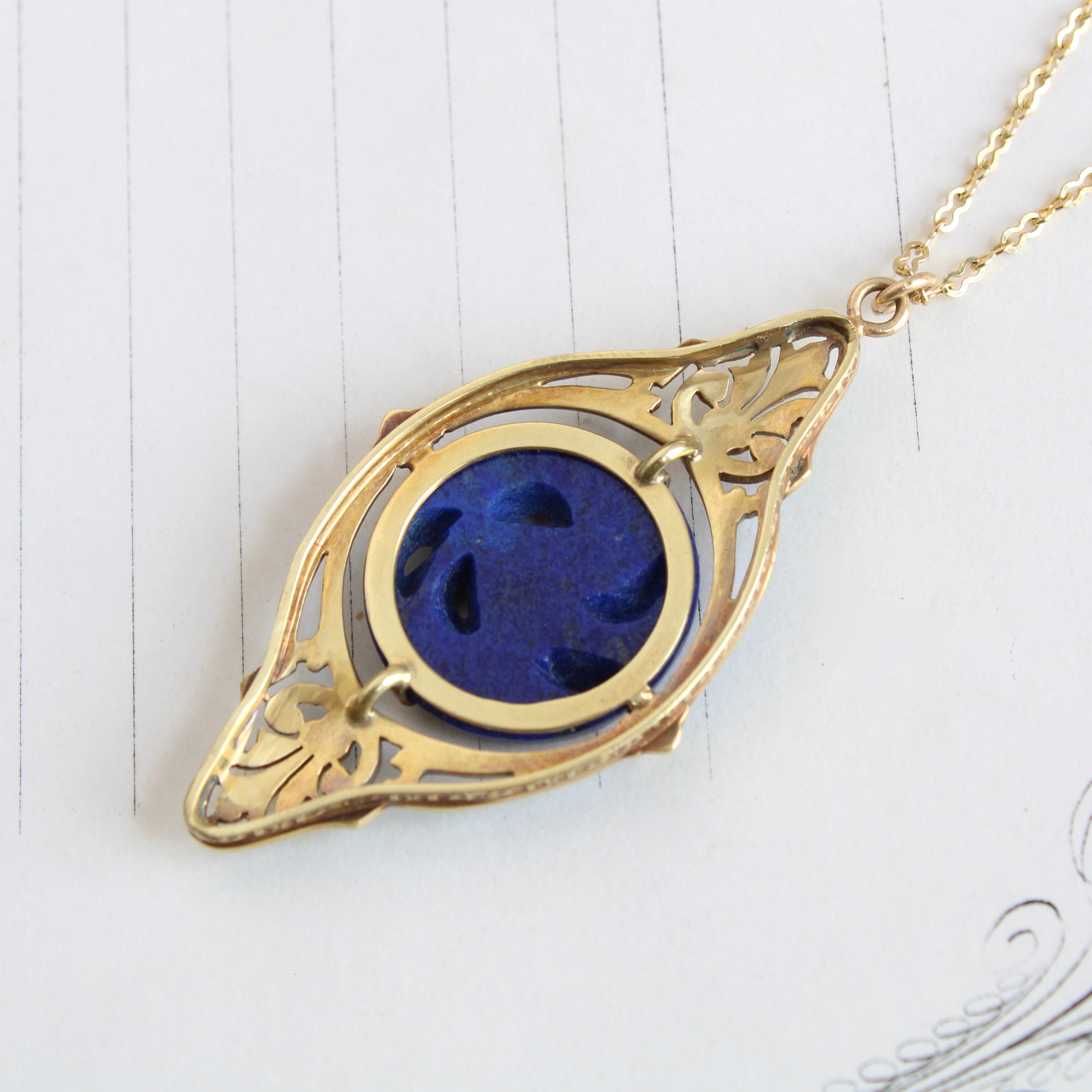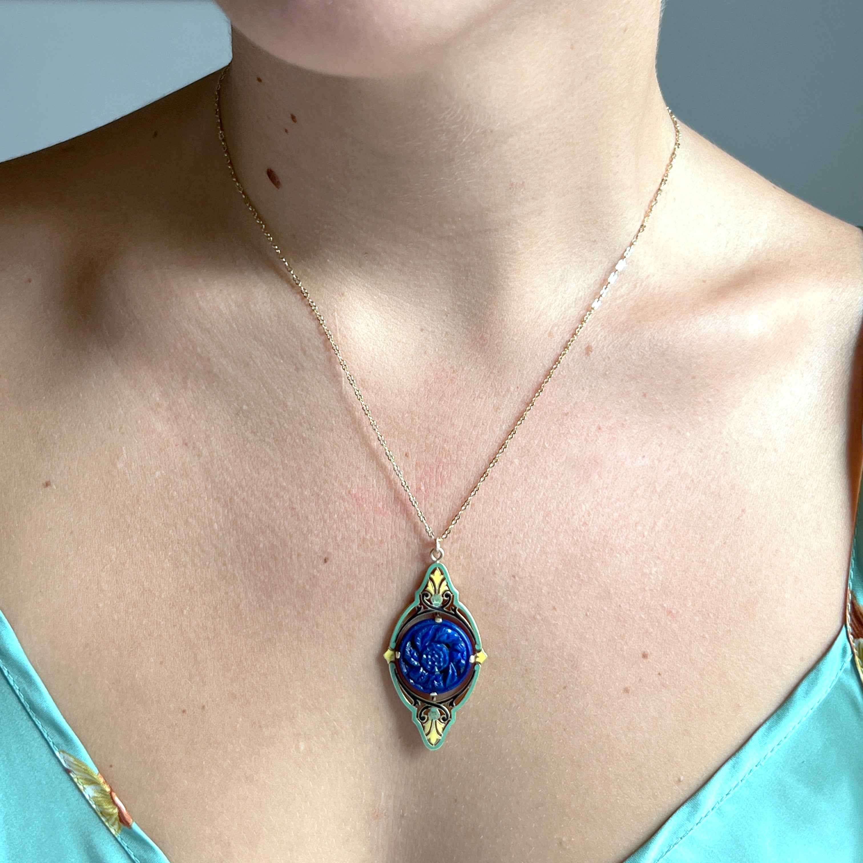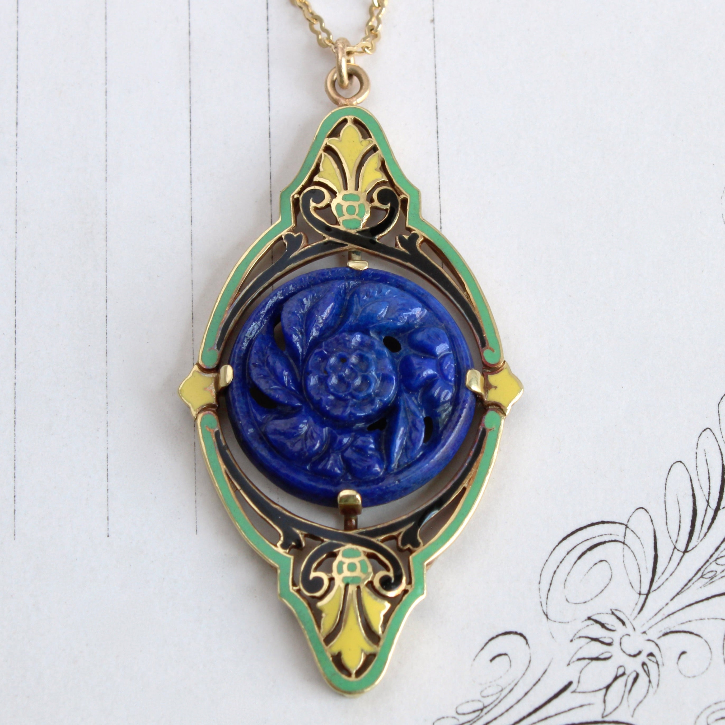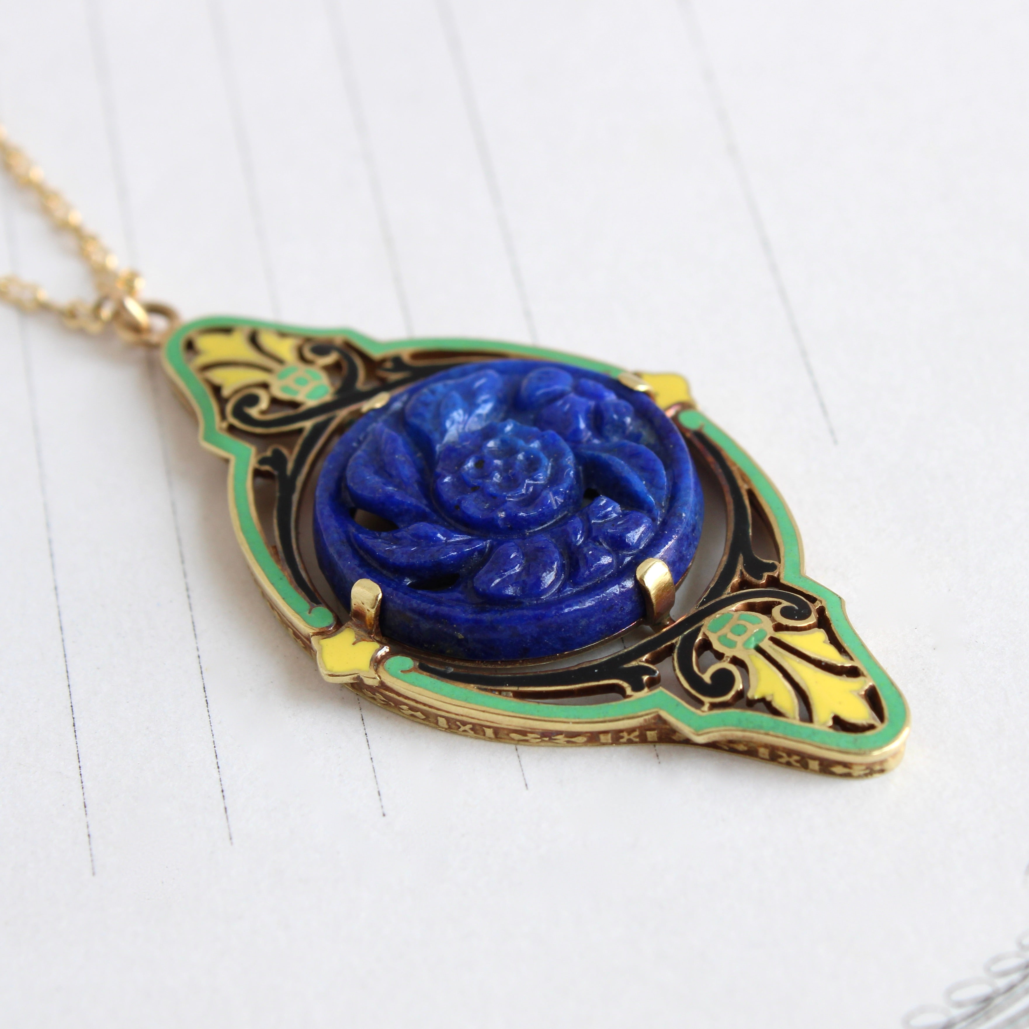 Circa 1920, an antique pendant crafted in 14k gold featuring a beautifully carved lapis lazuli plaque, in a richly enameled frame of green, yellow and black.