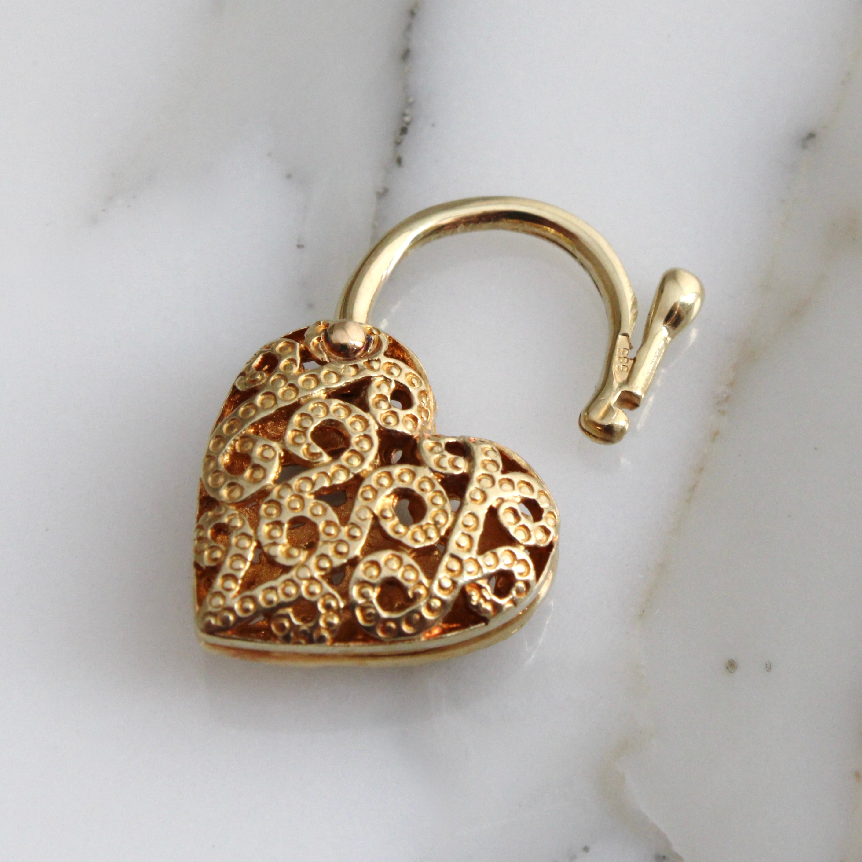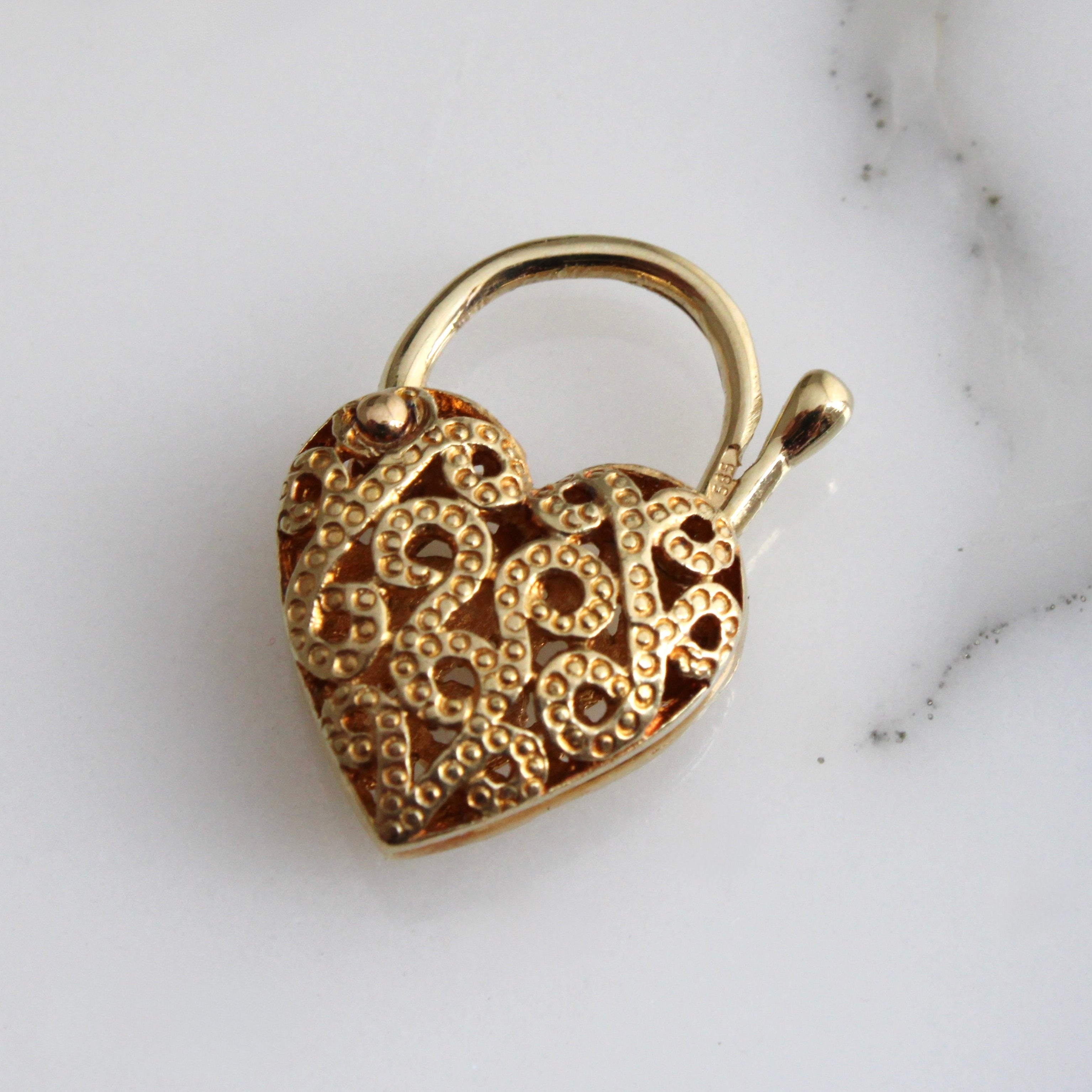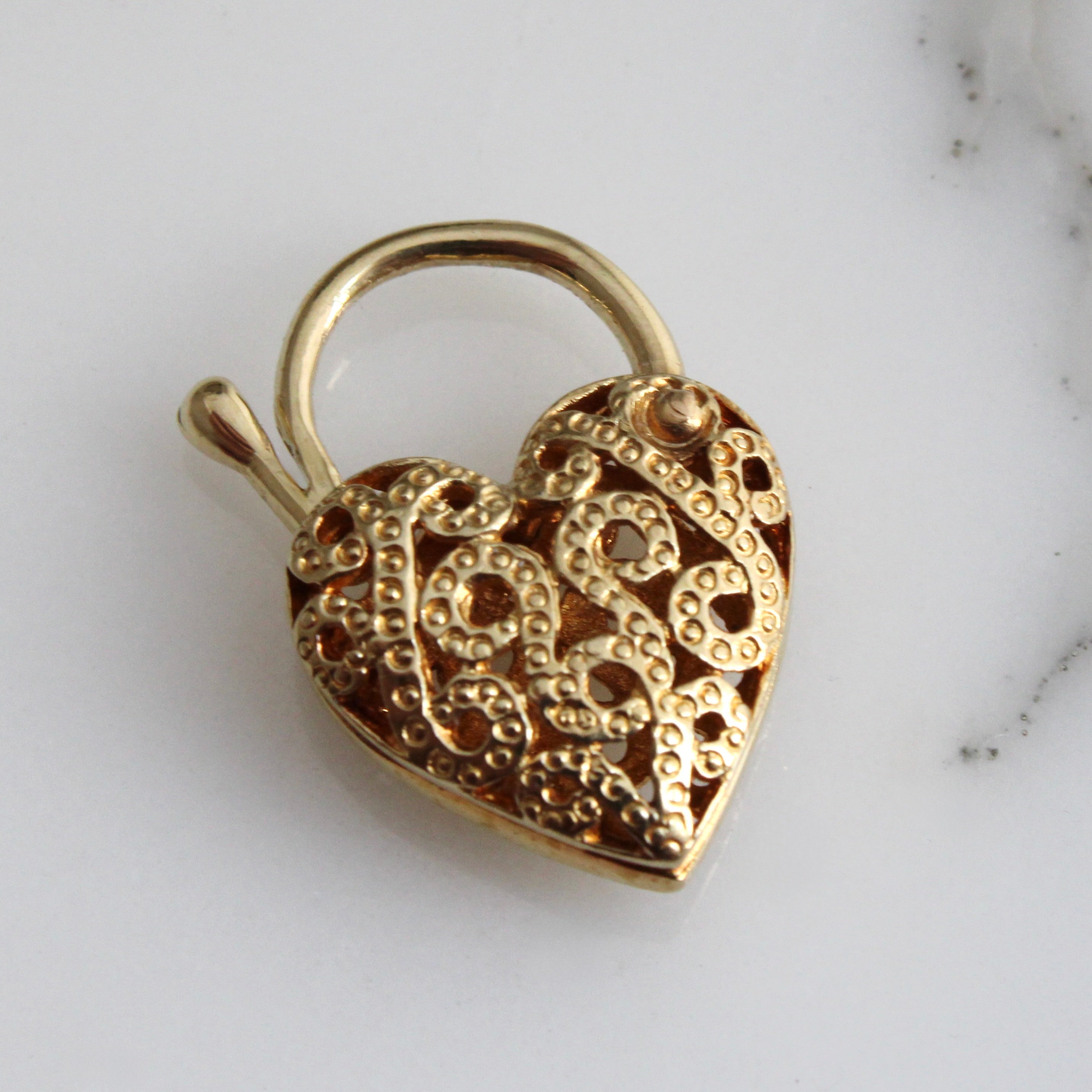 A sweet vintage heart-shaped padlock clasp circa 1950 crafted in solid 14k gold. A puffed construction with tiny dots patterning the lines of the articulation, the texture gives the gold a rich warm glow.