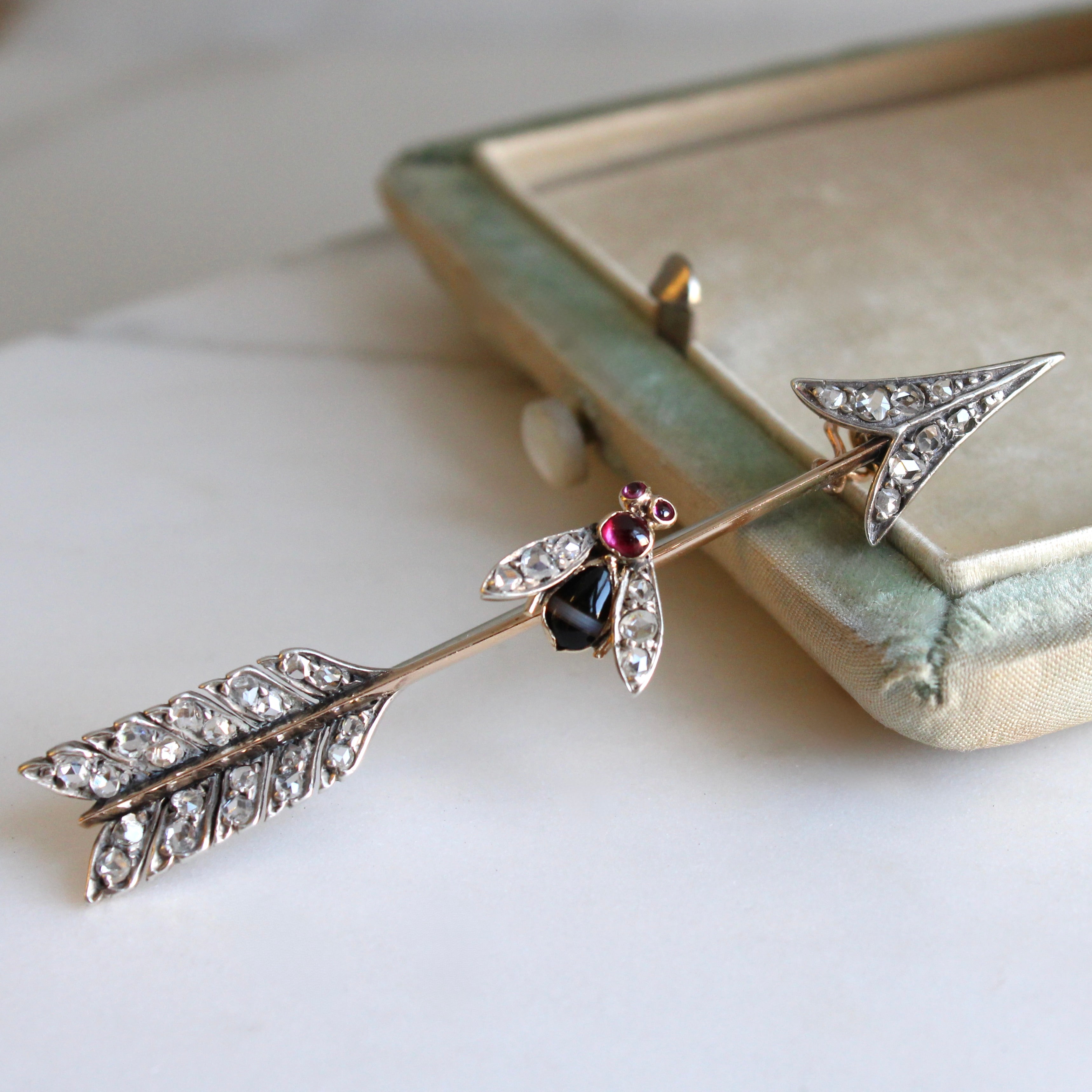 Brimming with positive symbolic meaning, the bee represented hard work and loyalty in the 19th century, with an association to the sweeter things in life- like honey and flowers- and bee themed jewels were often given to Victorian brides. The combo of the arrow adds to the theme of love- an arrow in this context could be associated with the idea of a "love struck" heart and true passion.