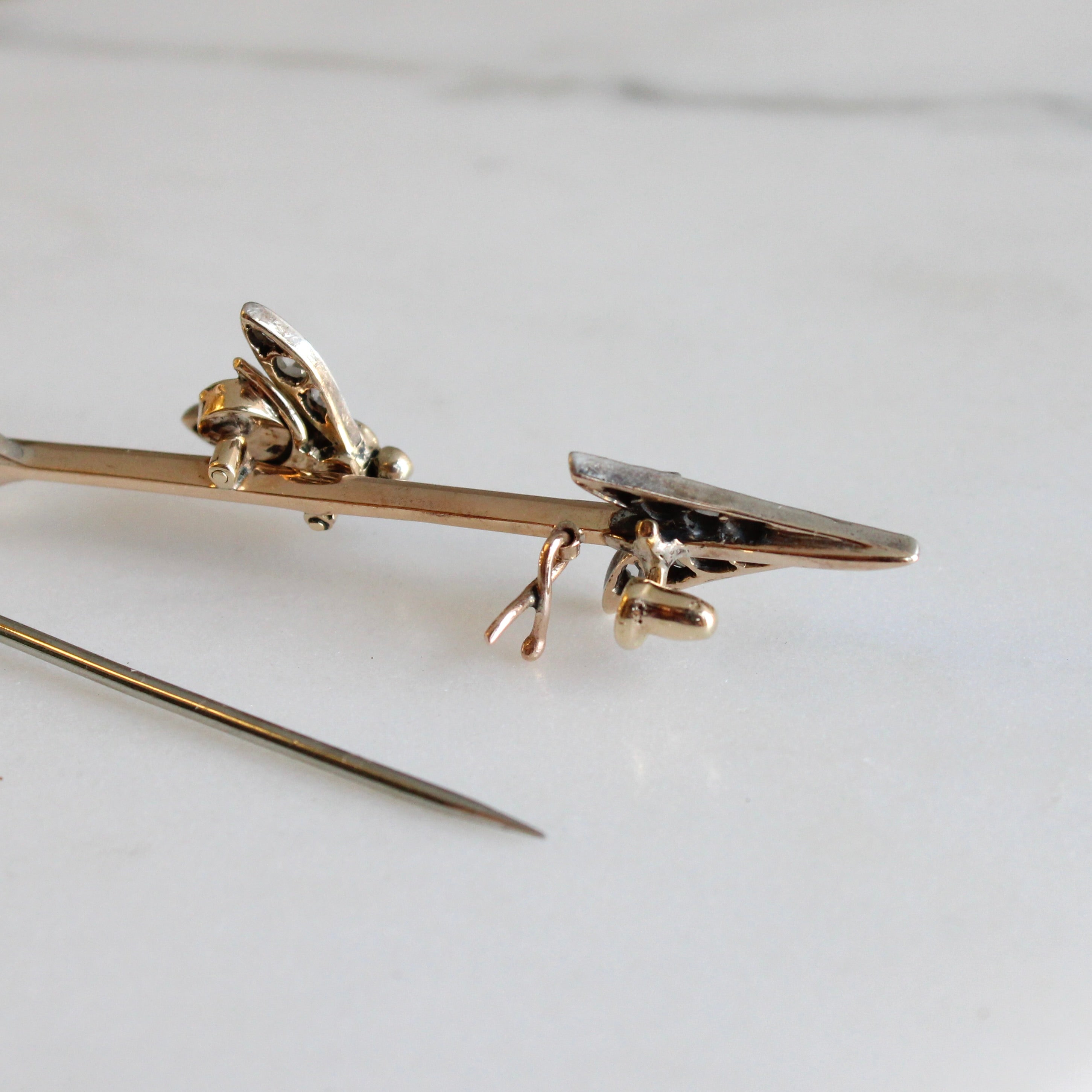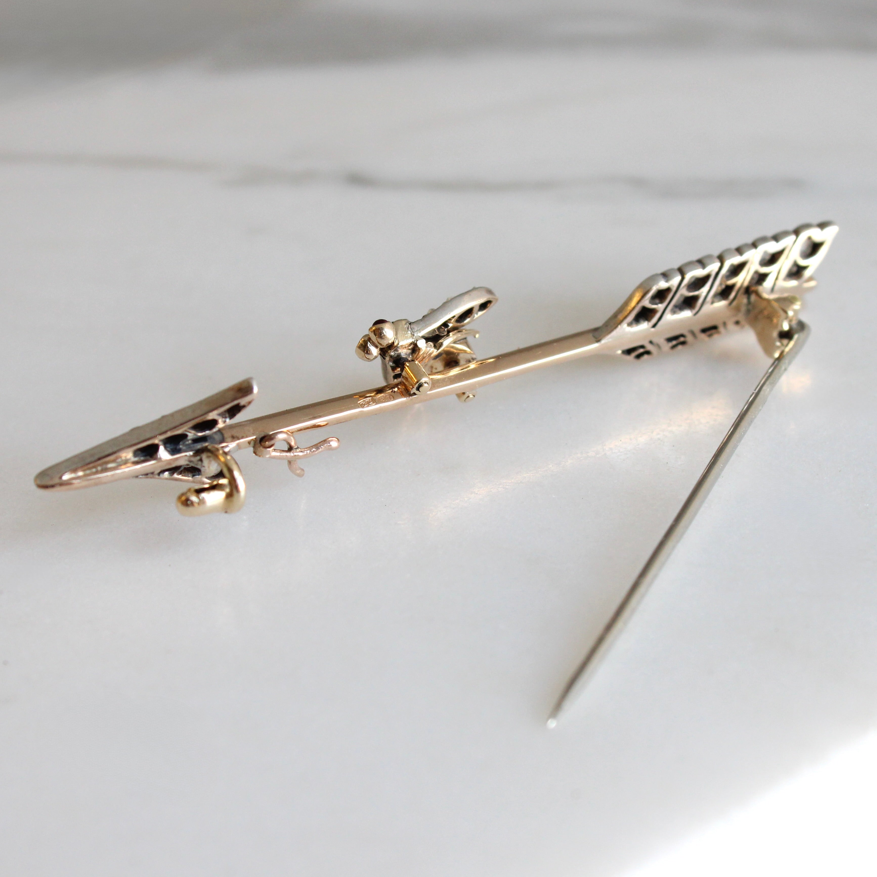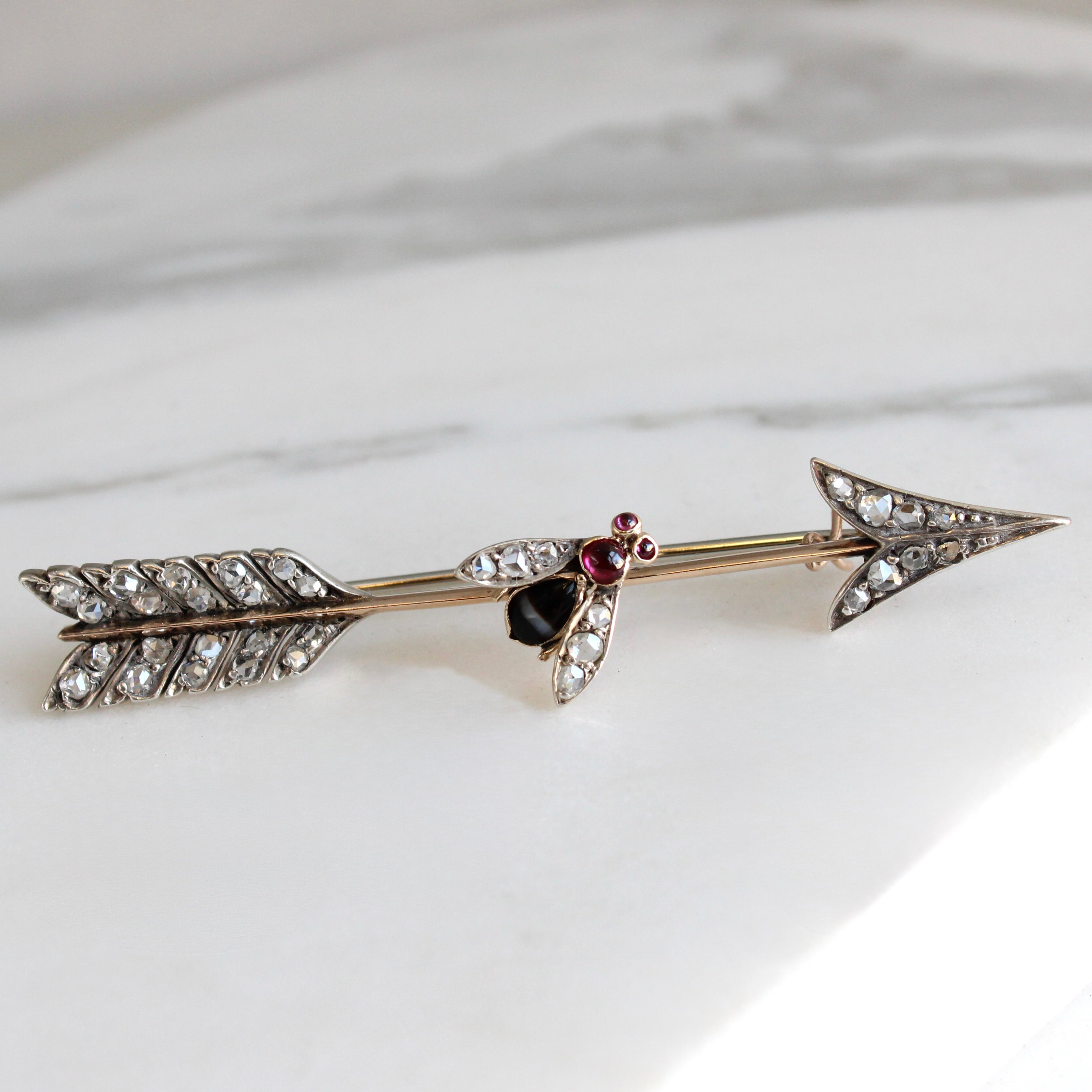 A wonderfully quirky antique Victorian brooch, circa 1885, featuring a friendly little bee with striped agate body and diamond studded wings, perched on the shaft of a diamond studded arrow.