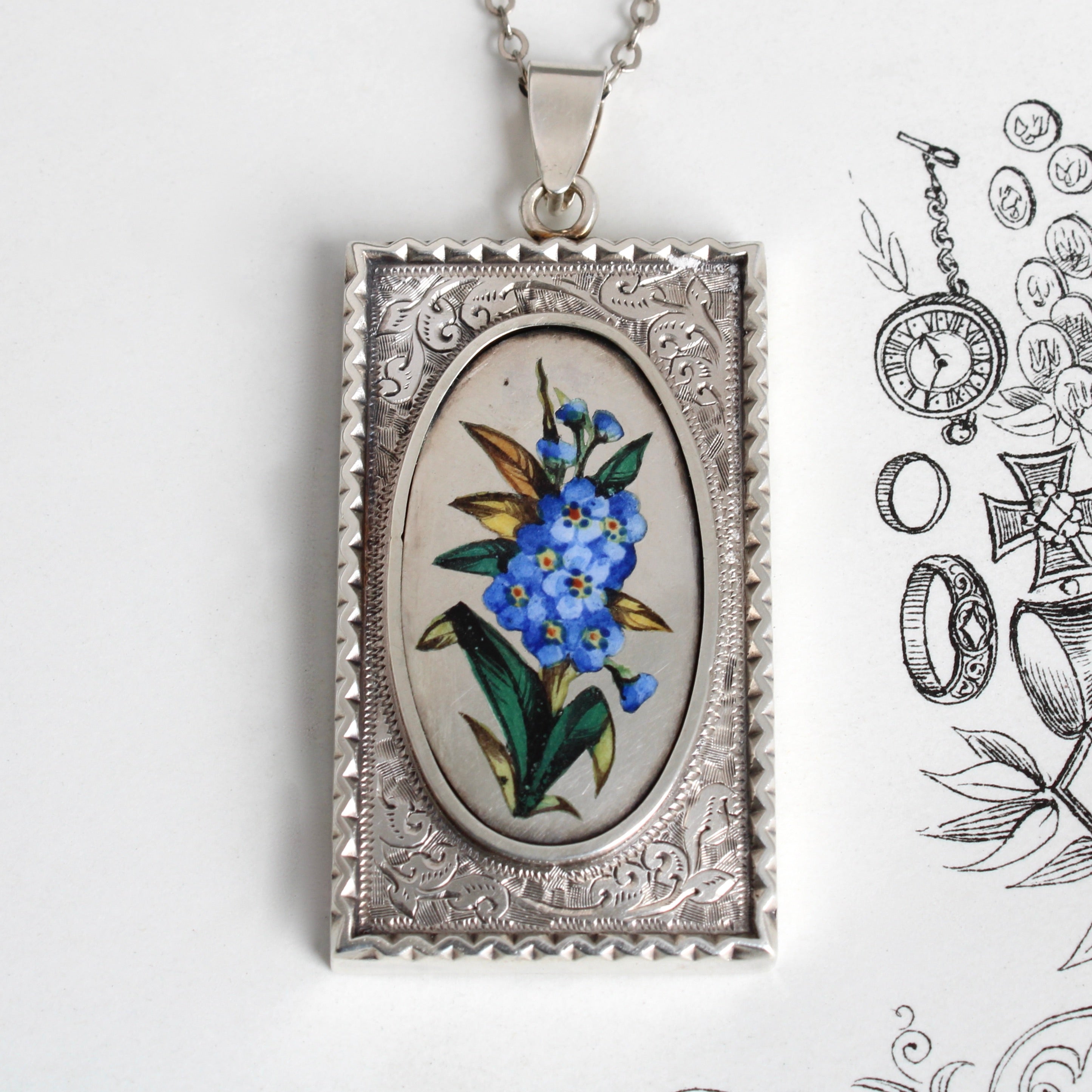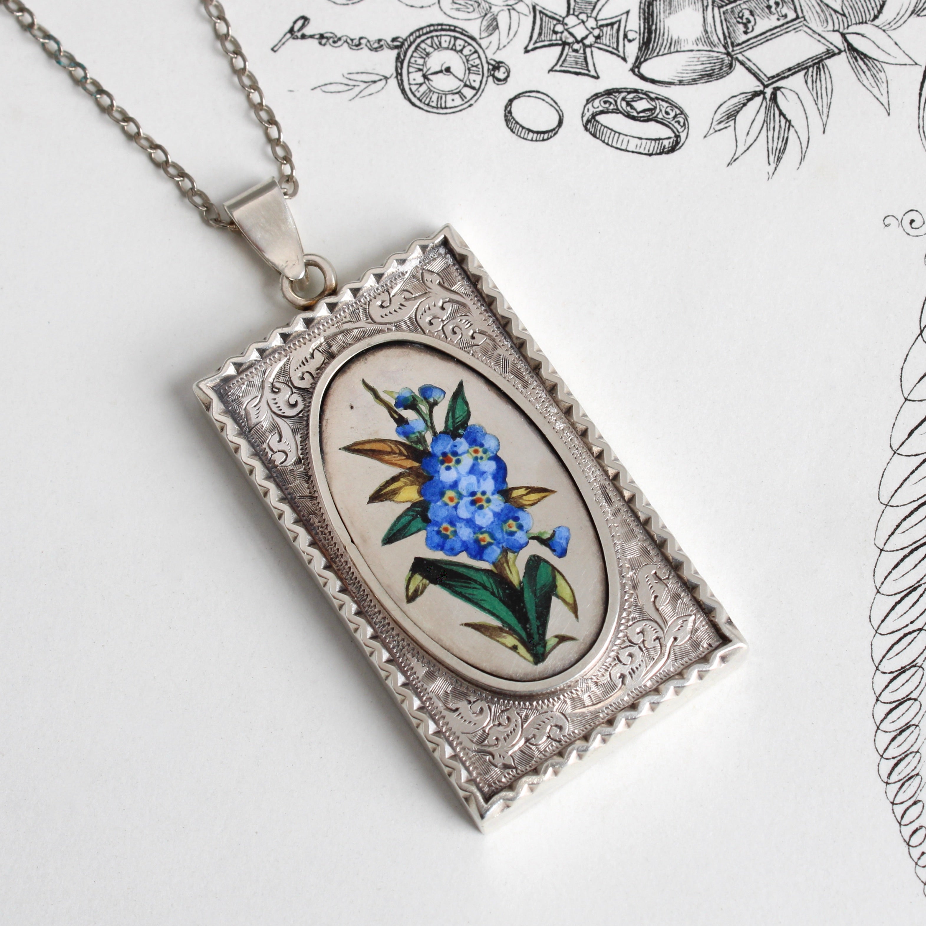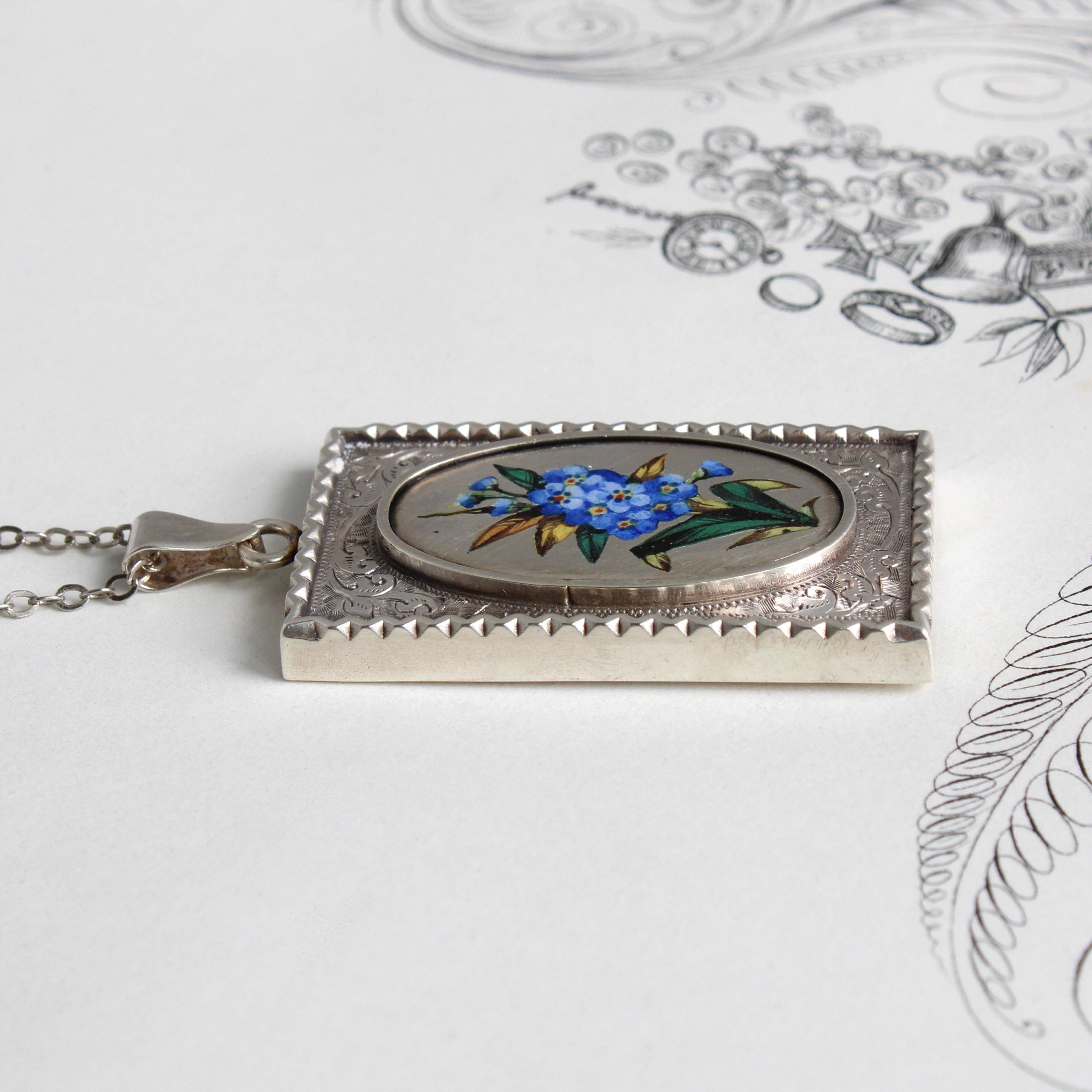 An antique sterling silver locket circa 1880, with gorgeous engraved detail, featuring a realistically illustrated enamel spray of forget-me-not, symbolic of regard and a sincere wish to be held dear in thought and memory.