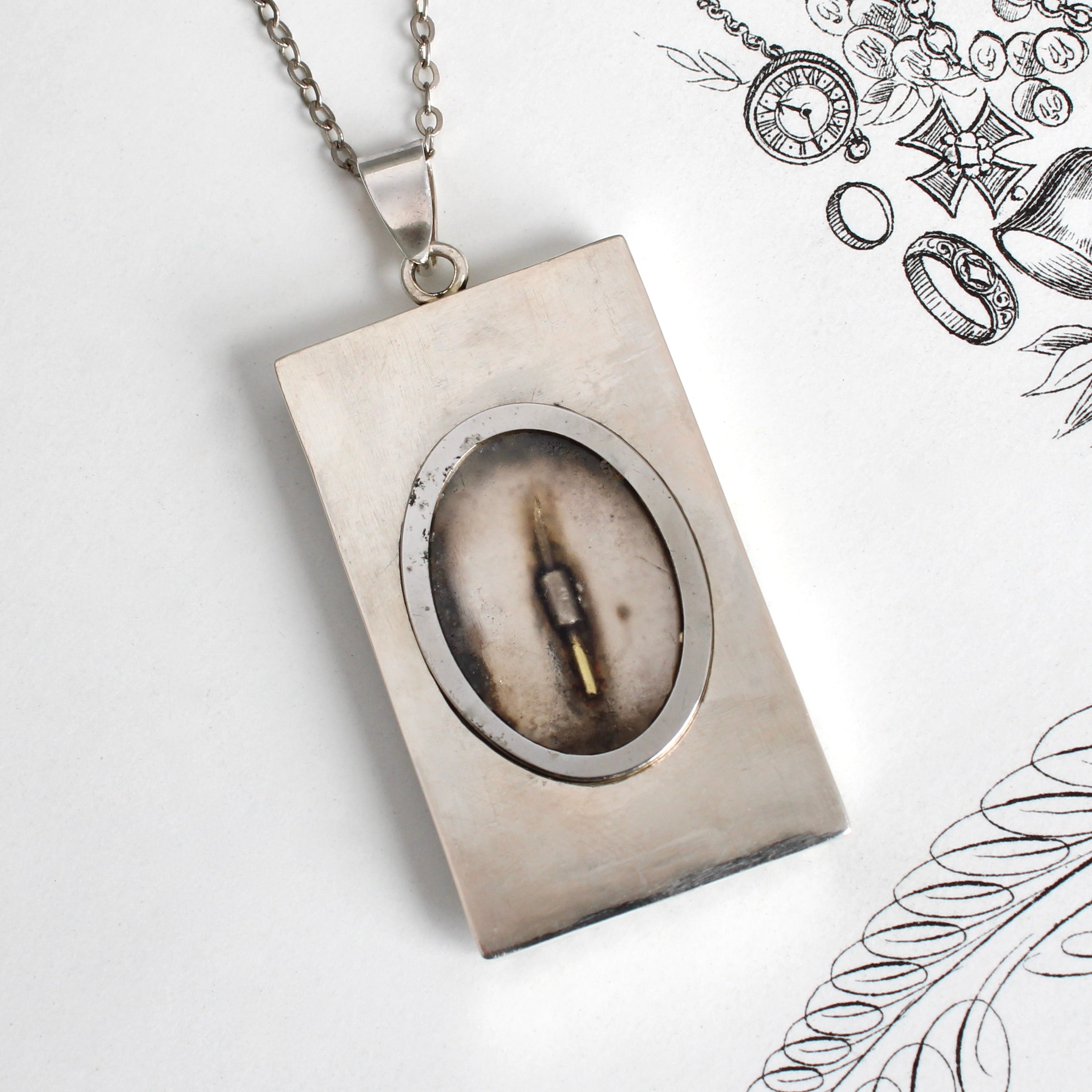 The compartment, visible at the back, can hold a photo or small memento such as a lock of hair, and is protected by a tension-fit glass-paned cover. Hung from a fine 22" sterling silver cable chain.