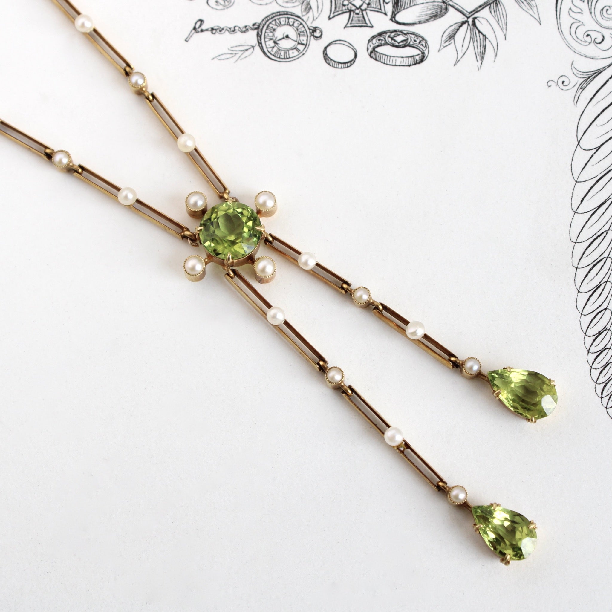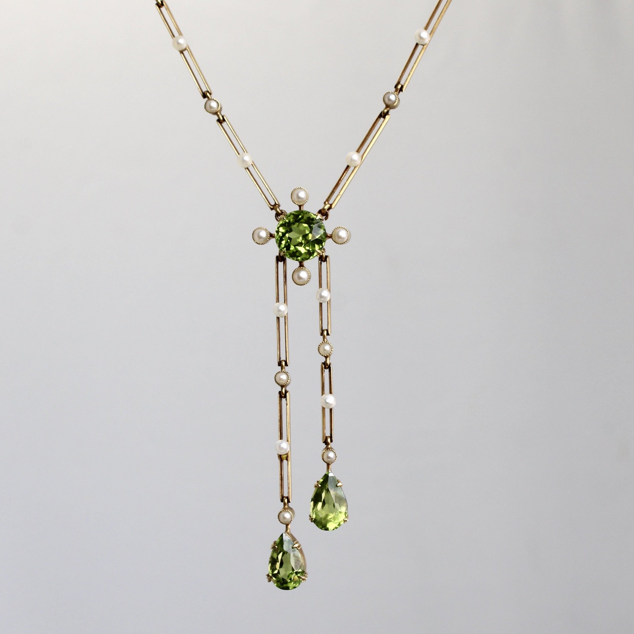 An elegant antique necklace, circa 1900, featuring genuine peridot of vivid saturation and bright sparkle; the creamy white pearls that dot the links have a soft glow, perfectly accenting the rich green color of the gems.