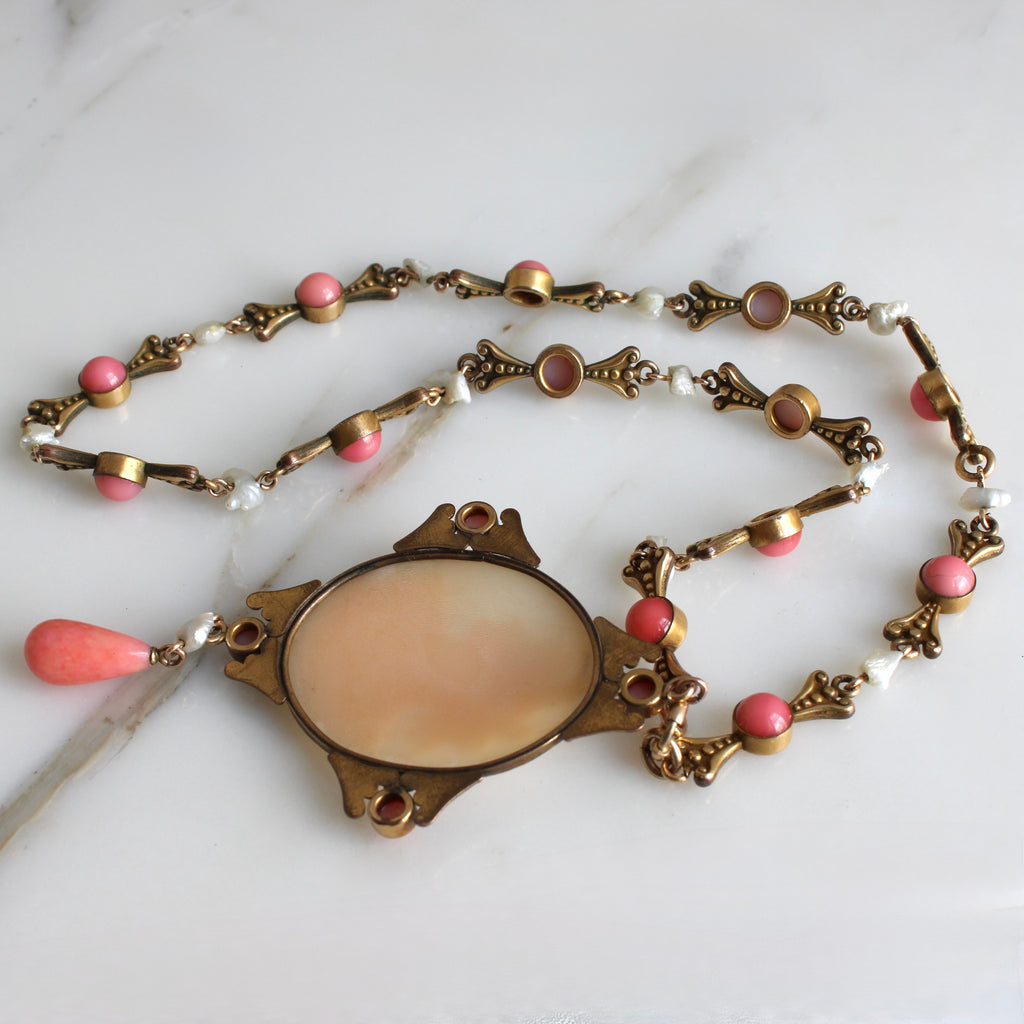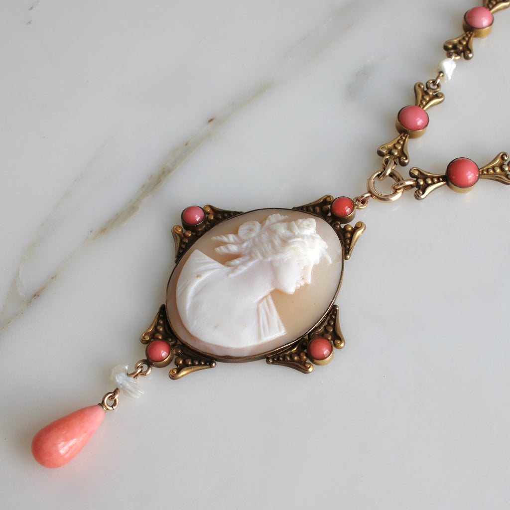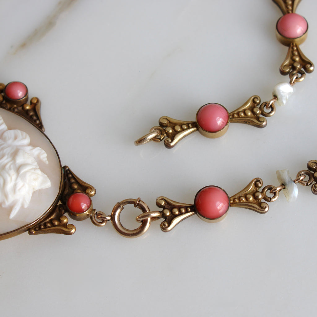 An antique Victorian Revival statement necklace, circa 1915, featuring a hand-carved shell cameo of a classical beauty with glass coral and natural river pearl accents set in gilt base metal. A beautiful combination, the details shine against the rich patina of the golden metal, I think this would be an elegant bridal jewel for the bride with a romantic Victorian aesthetic.