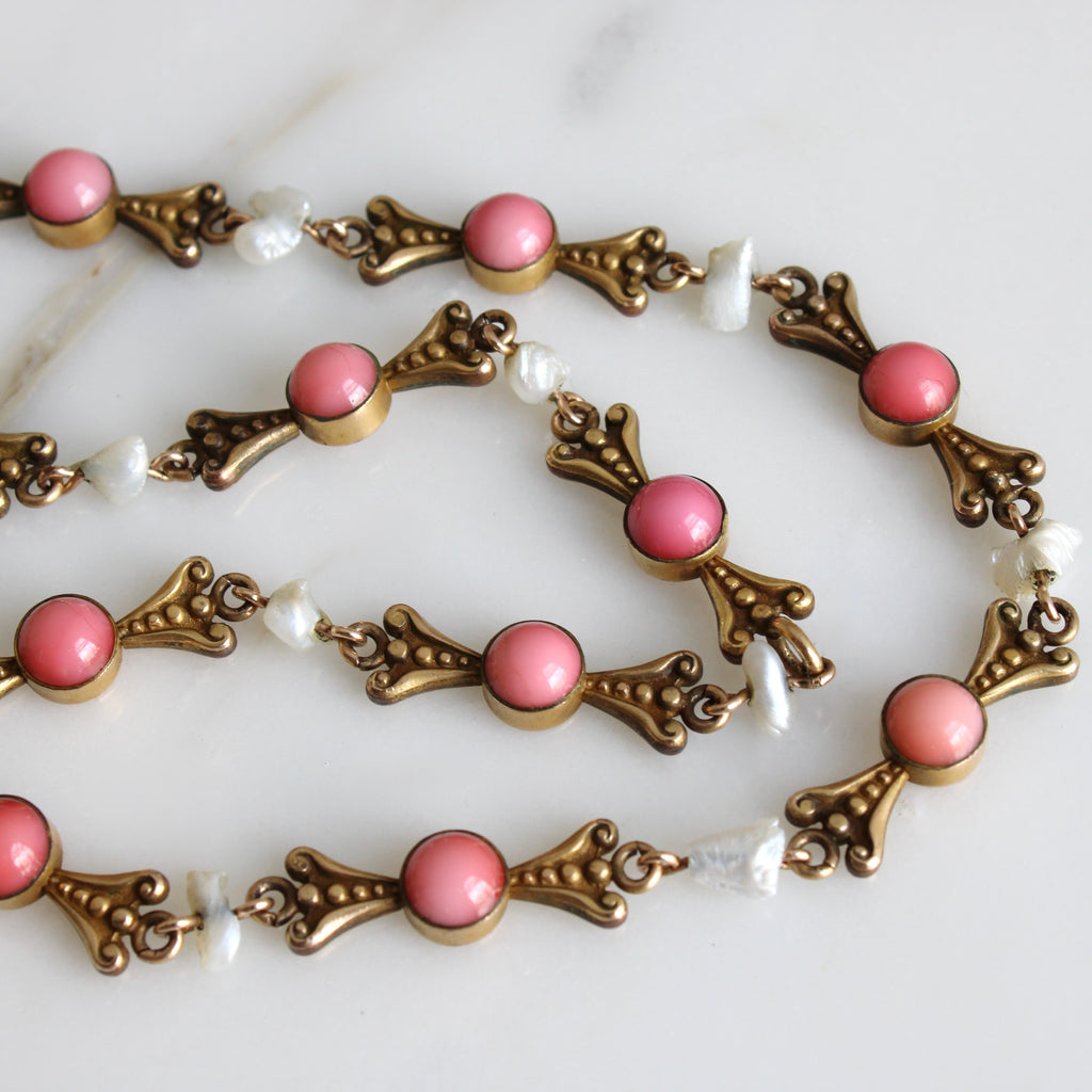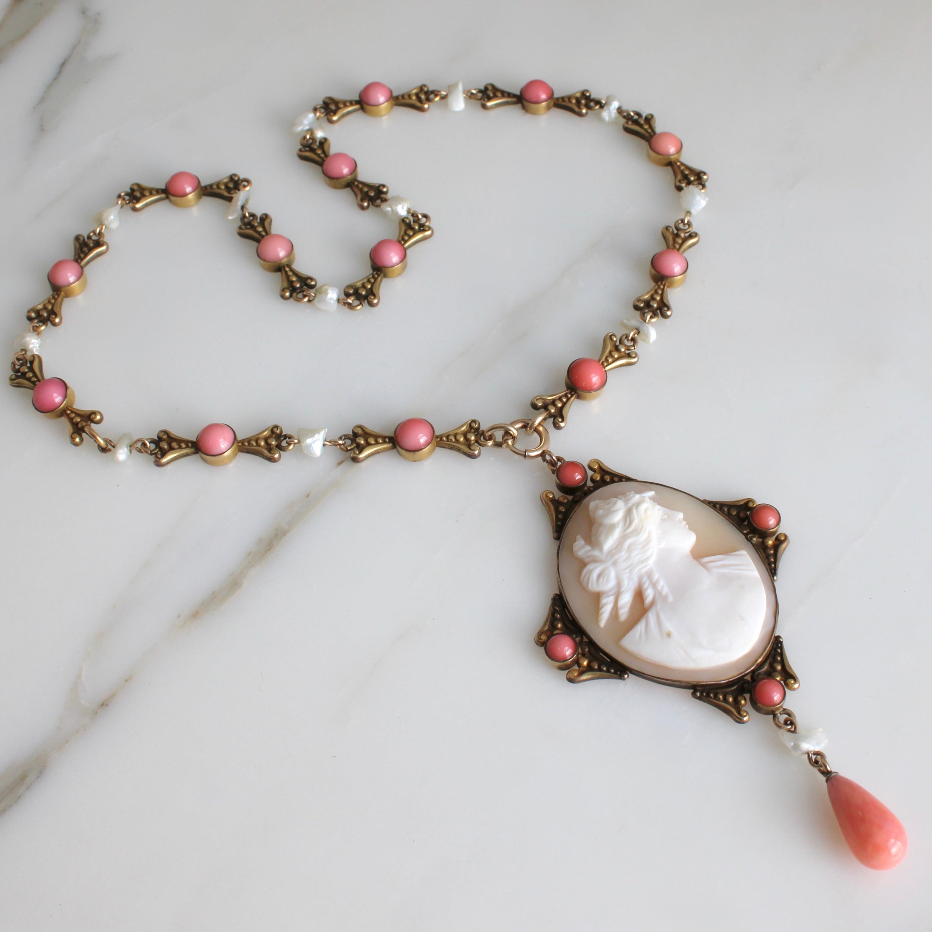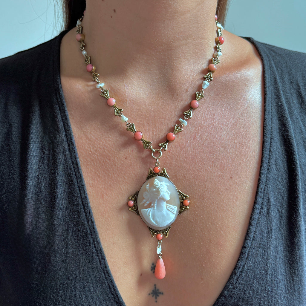 An antique Victorian Revival statement necklace, circa 1915, featuring a hand-carved shell cameo of a classical beauty with glass coral and natural river pearl accents set in gilt base metal. A beautiful combination, the details shine against the rich patina of the golden metal, I think this would be an elegant bridal jewel for the bride with a romantic Victorian aesthetic.