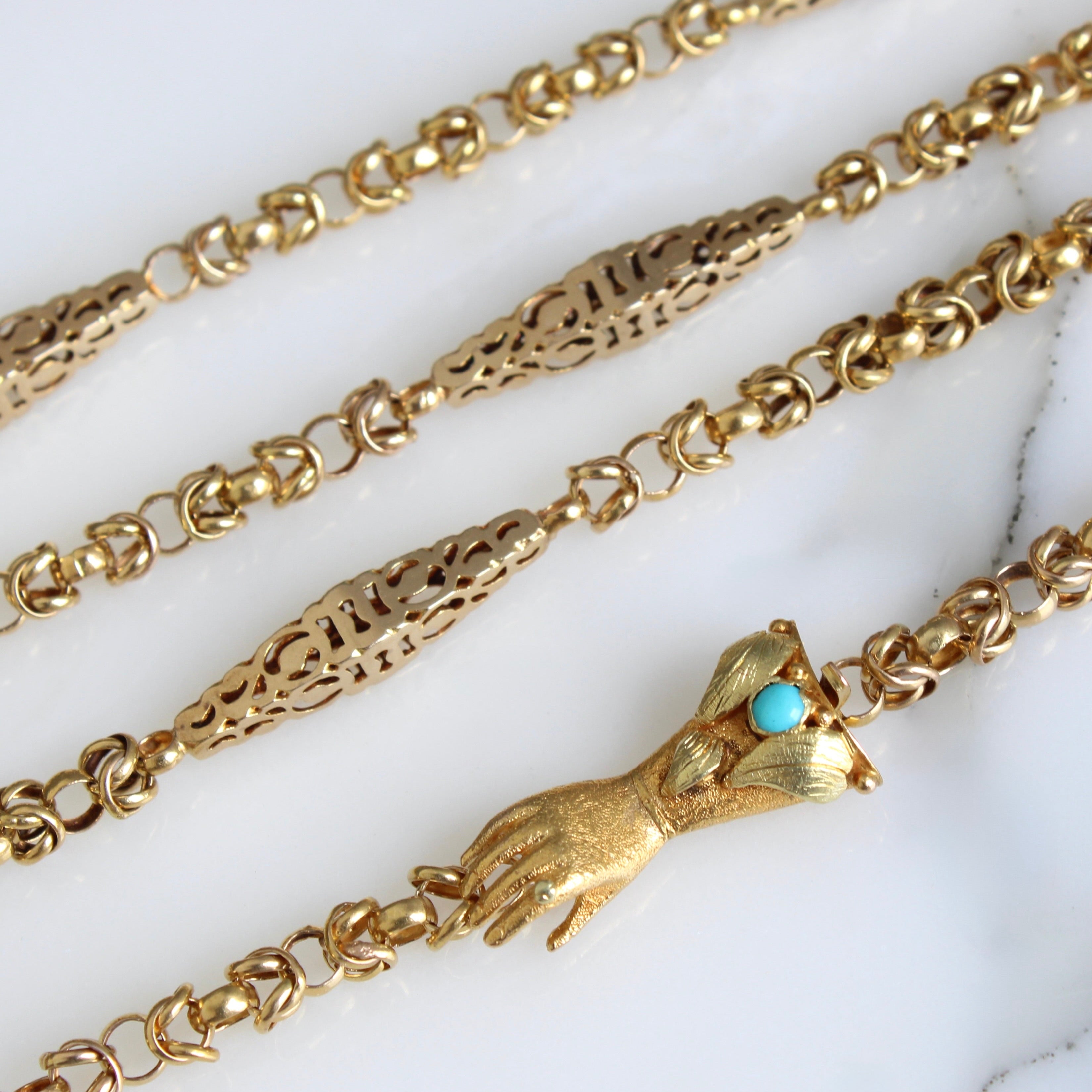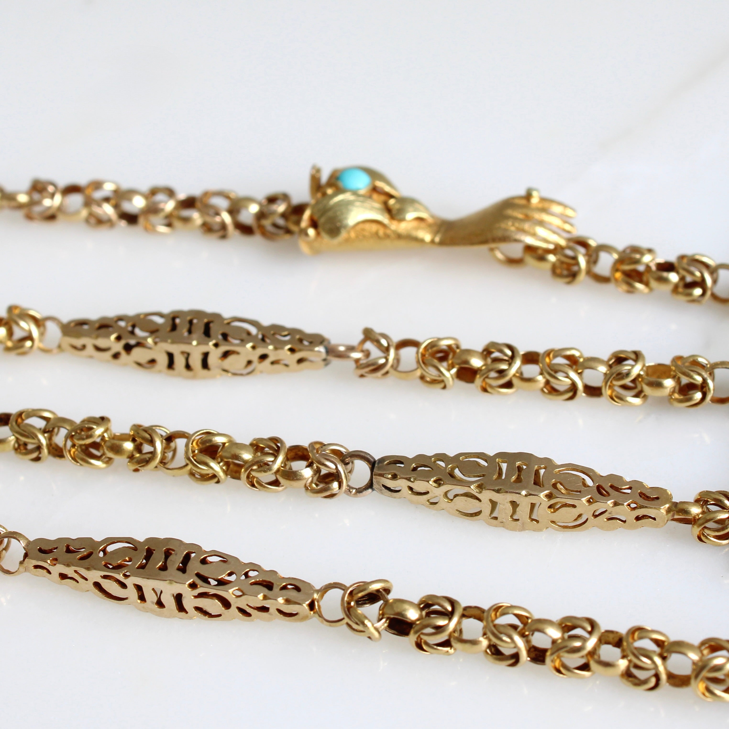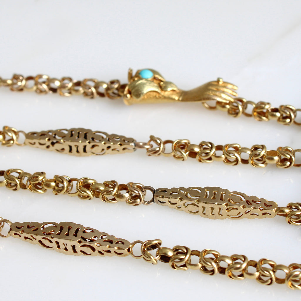 A fantatasic long gold Georgian chain, circa 1820, alternating elongated barrel links with sections of cleverly constructed belcher puzzle chain. The decorative hand clasp wears a tiny gold ring and has a turquoise flower with leaflets as an accent at the cuff.