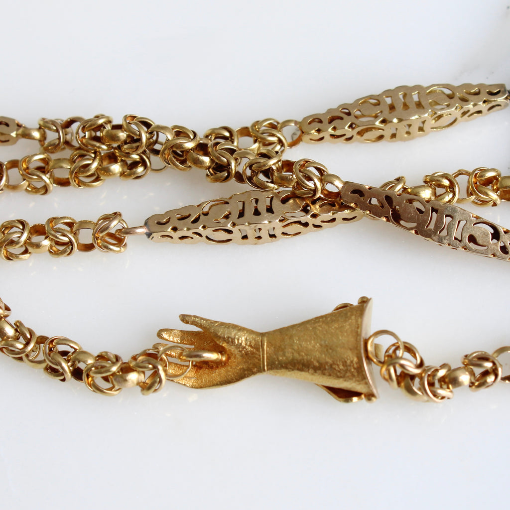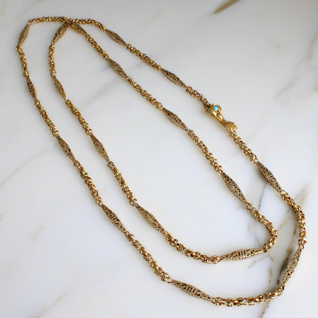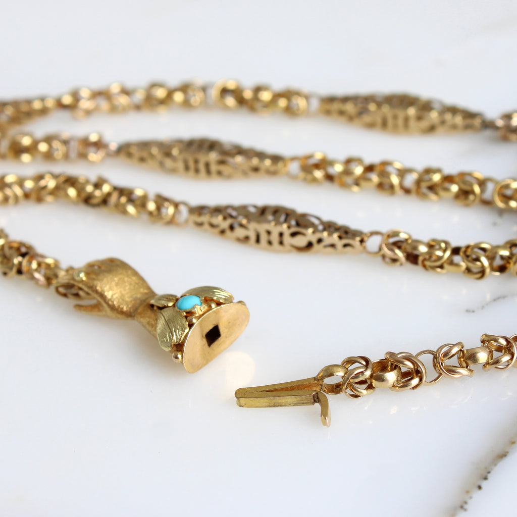 A fantatasic long gold Georgian chain, circa 1820, alternating elongated barrel links with sections of cleverly constructed belcher puzzle chain. The decorative hand clasp wears a tiny gold ring and has a turquoise flower with leaflets as an accent at the cuff.