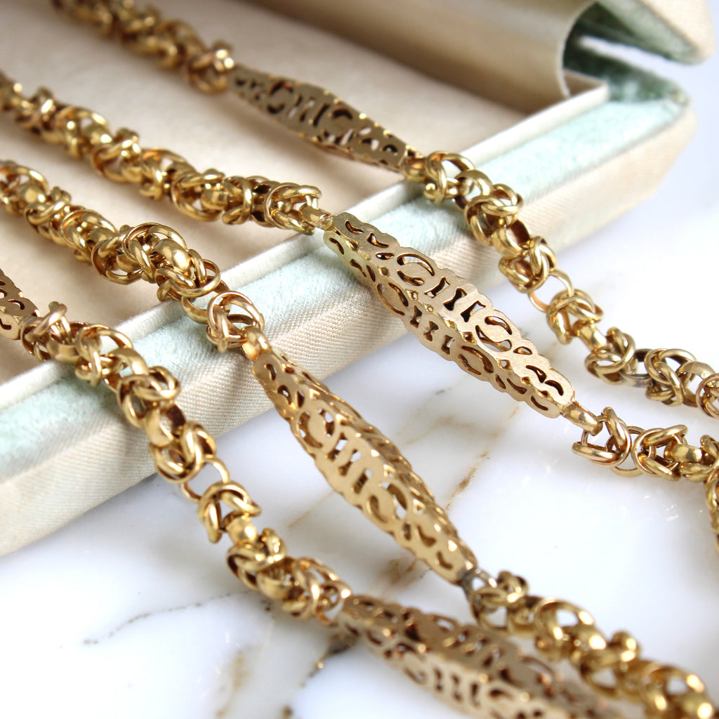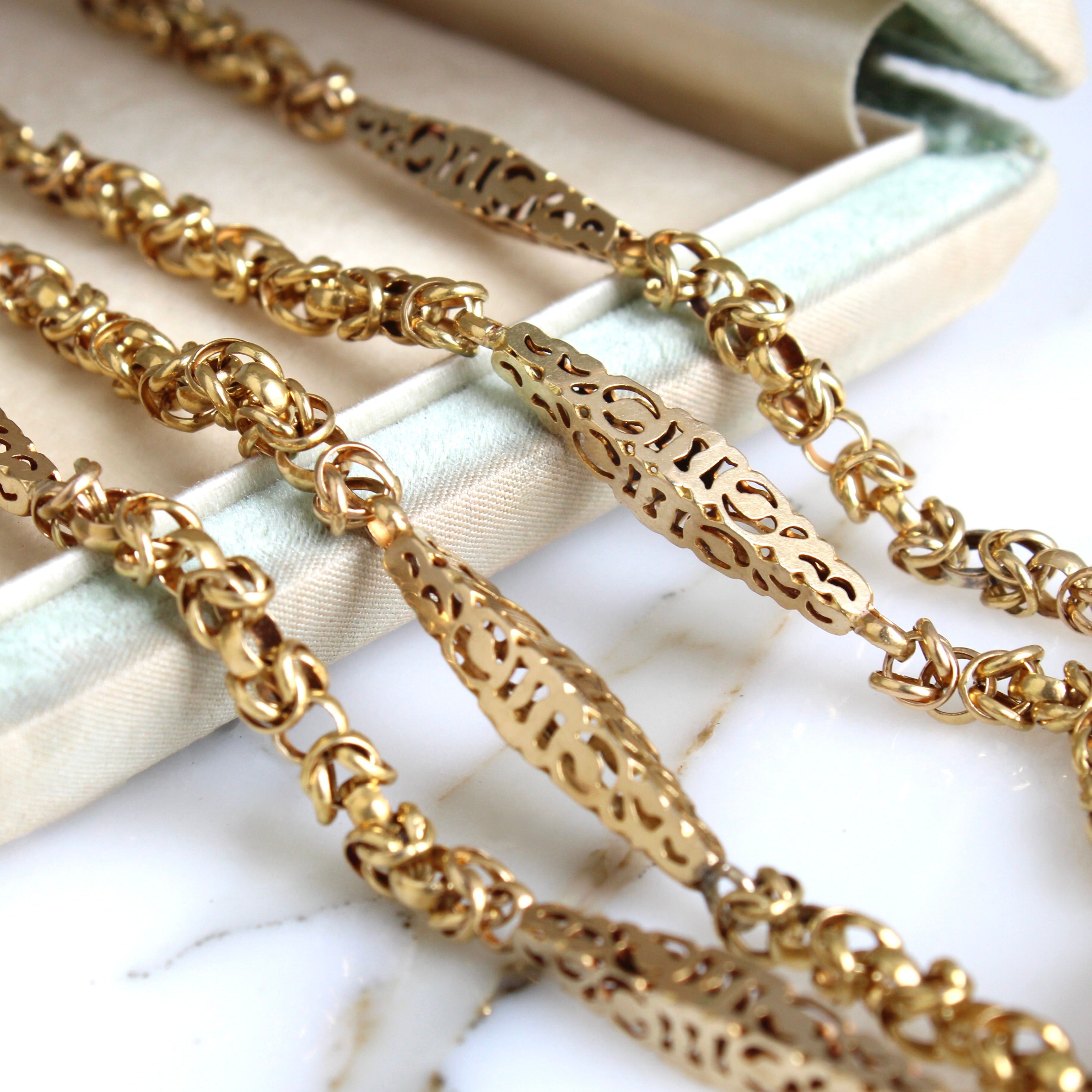 Details: Measures approximately 46" long with the links approximately 4.6 mm at the widest. Not marked for gold content, the barrel links XRF test to 16k, the puzzle chain to 18k and the hand clasp to 20k. Weighs approximately 37.5 grams.