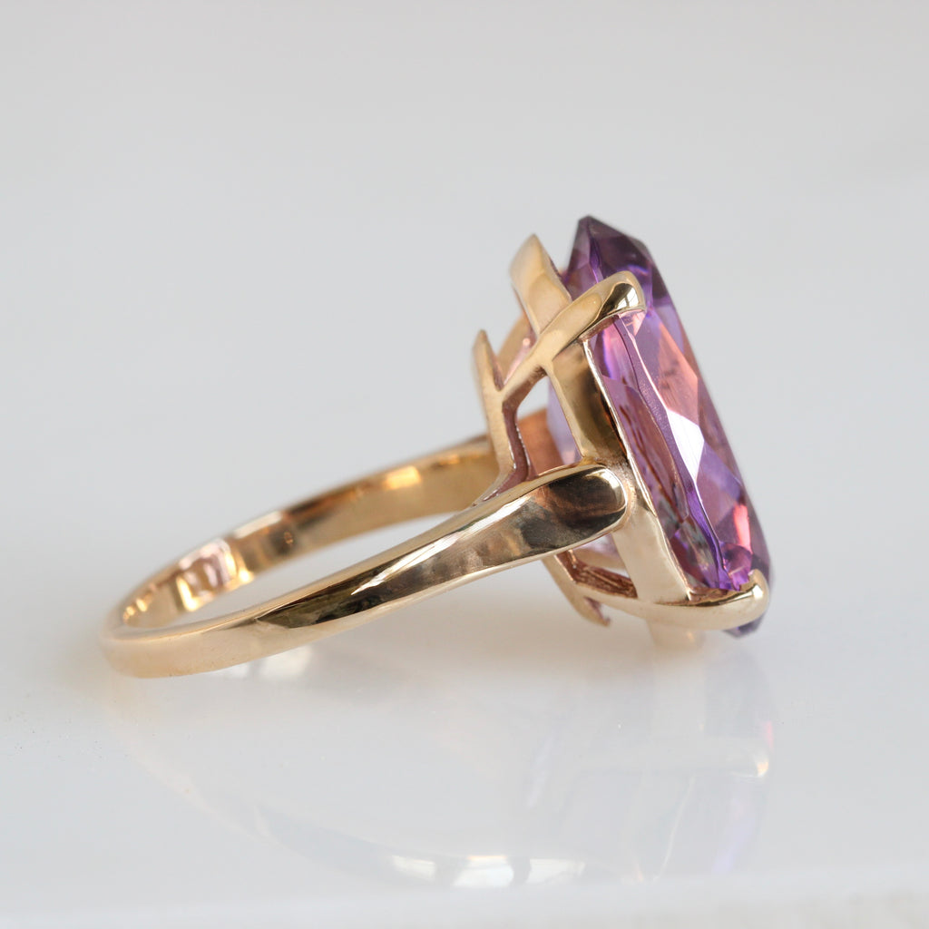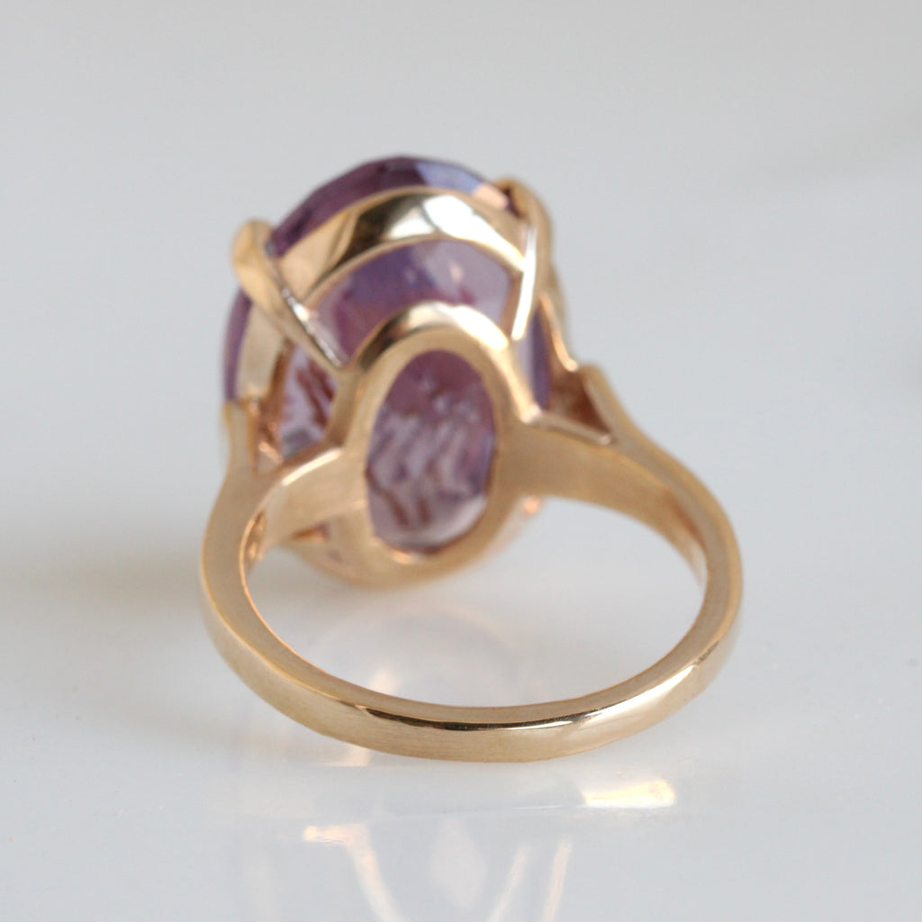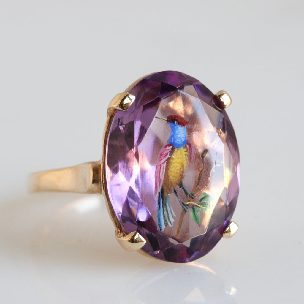 The focal point of this unique solitaire ring is a wonderful Victorian art glass "amethyst", the image of a colorful Bird-of-Paradise fired inside the body of the gem itself, much like the technique used in Italian or French glass ware. At some point in the mid-20th century it was set in a 14k yellow gold statement gem mounting, I doubt you'll ever see another like it.
