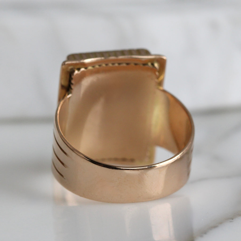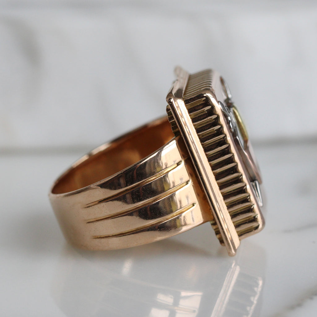 A hefty late 19th century signet crafted in 18k rose gold with a shield and crossed sword motif applied to the face, in mixed platinum, yellow and rose gold. Not necessarily meant to refer to any crest in particular, the symbolism here as interpreted from the traditional heraldic lexicon refers to a bravery, determination and leadership.