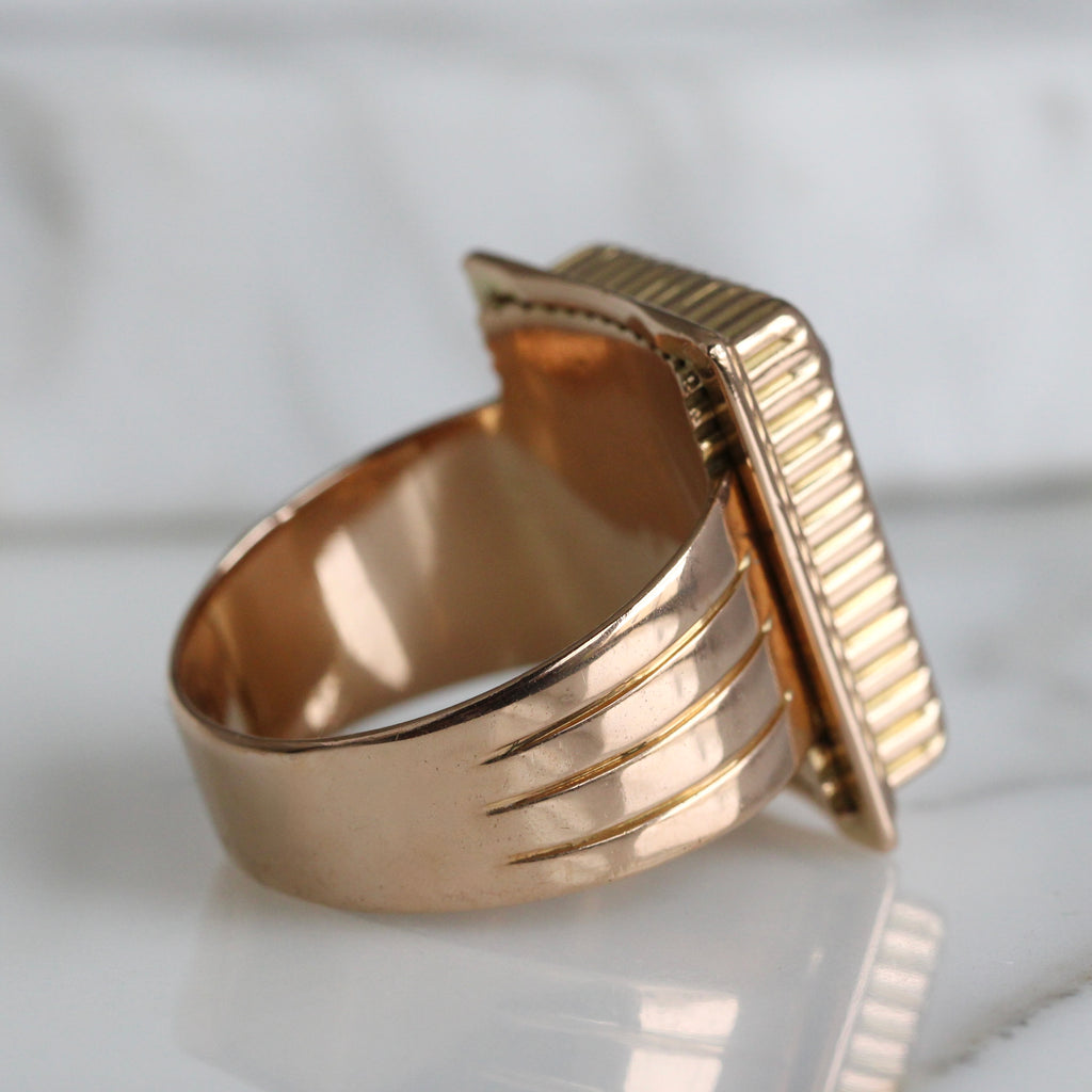 Details: Measures approximately 7/8" high and 11/16" wide" across the face. Not marked for metal content but XRF tests to solid 18k,  and weighs approximately 14.7 grams.