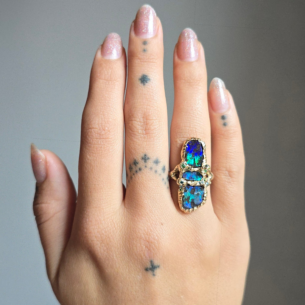 Our handmade boulder opal statement ring features a trio of incredible gemstones with leopard-like patterns of peacock blue and green vibrating around an ironstone matrix and electric flashes of teal, marine and chartreuse at certain angles. Sparking accents of blue topaz, blue and green diamonds and tsavorite garnet play to the galactic bursts of color.