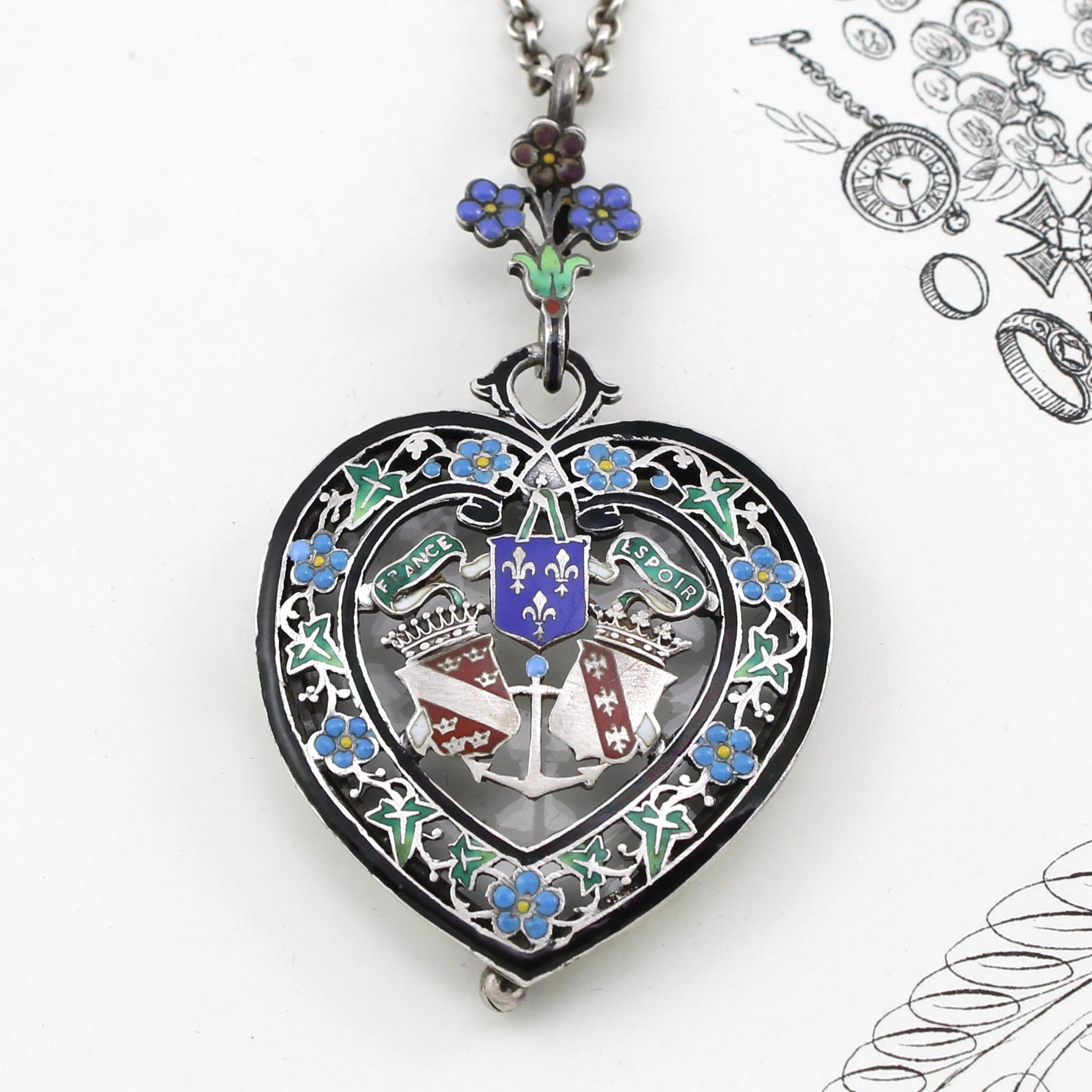 A border of ivy leaves (symbolizing fidelity) and forget-me-nots (eponymous) frames the shields while the ornate bail is decorated by both enameled forget-me-nots and pansies ("remember me").
