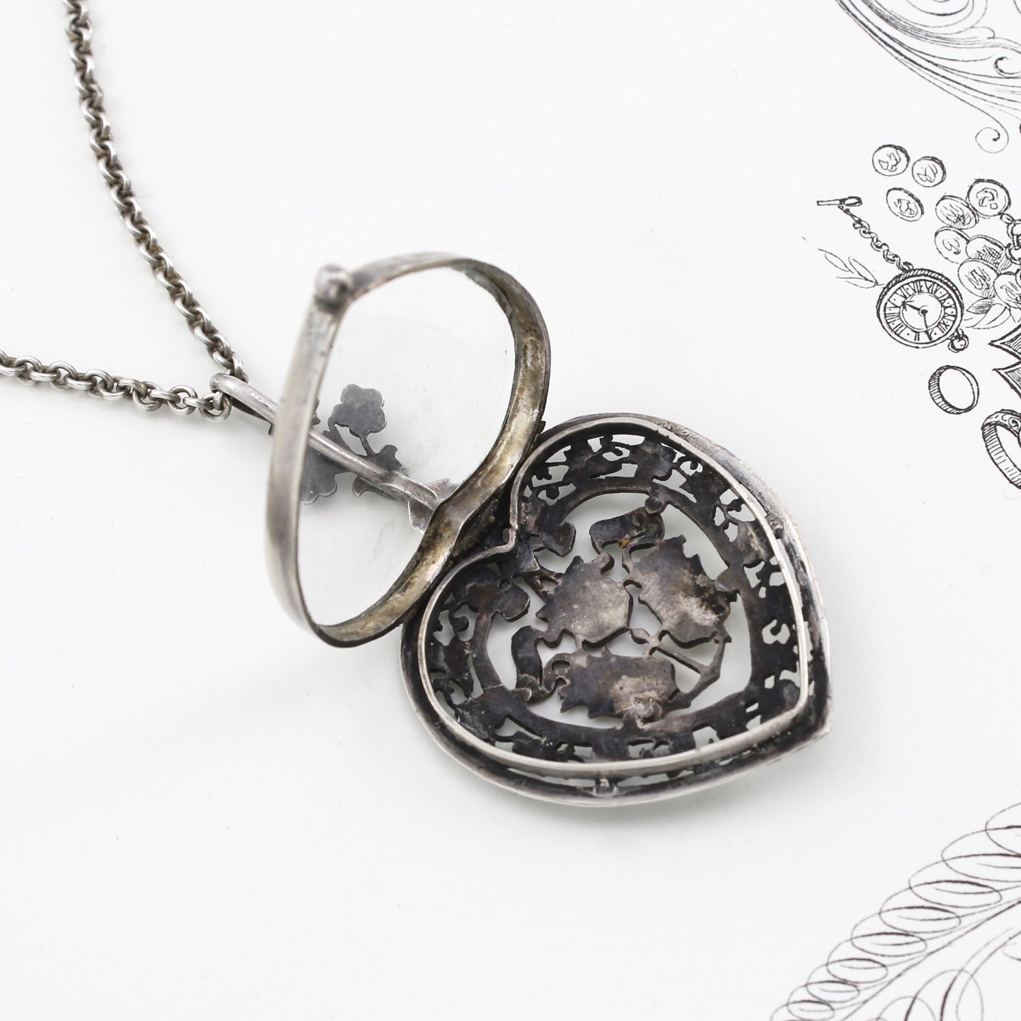 CONDITION: In excellent condition with a rich antique patina and some light wear to the enamel on the heart's bail and the black border around the edge of the locket. Not marked for metal content but acid tests to around 900 silver. The chain is marked for sterling.