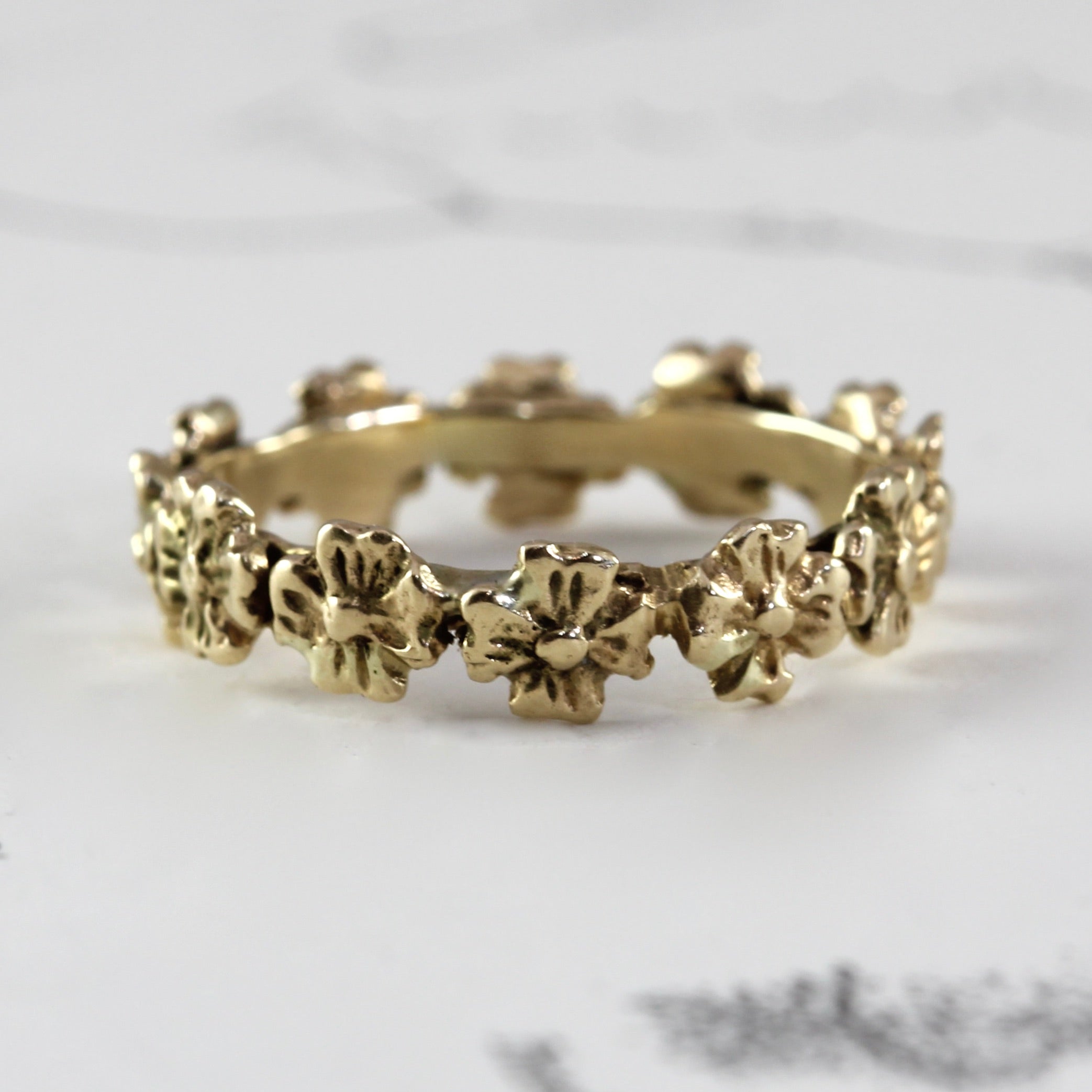 We designed our 14k dogwood eternity band with the traditional floral symbolism of the bloom in mind: signifying constancy and endurance, the dogwood's message makes this a lovely choice as an alternative wedding band or anniversary gift.