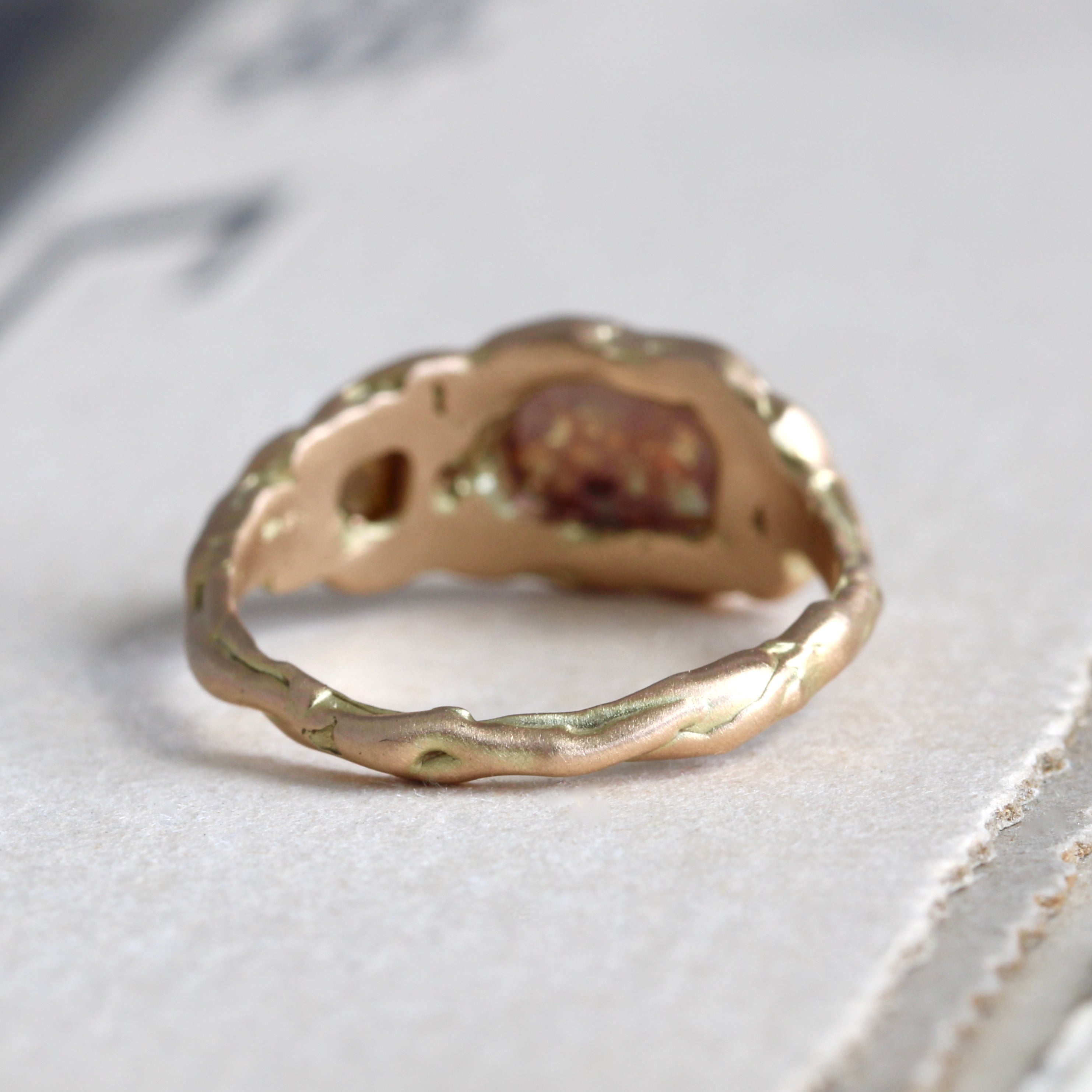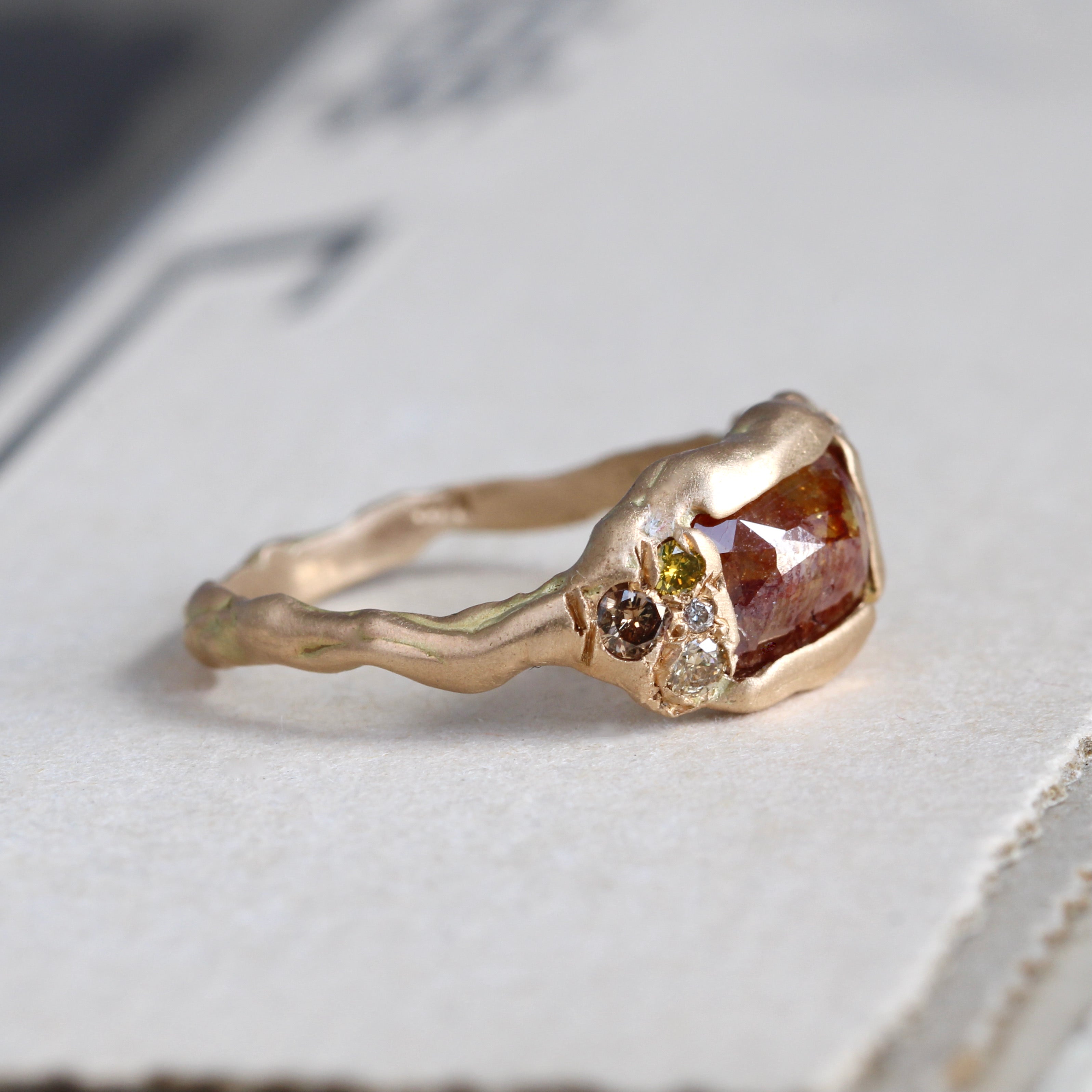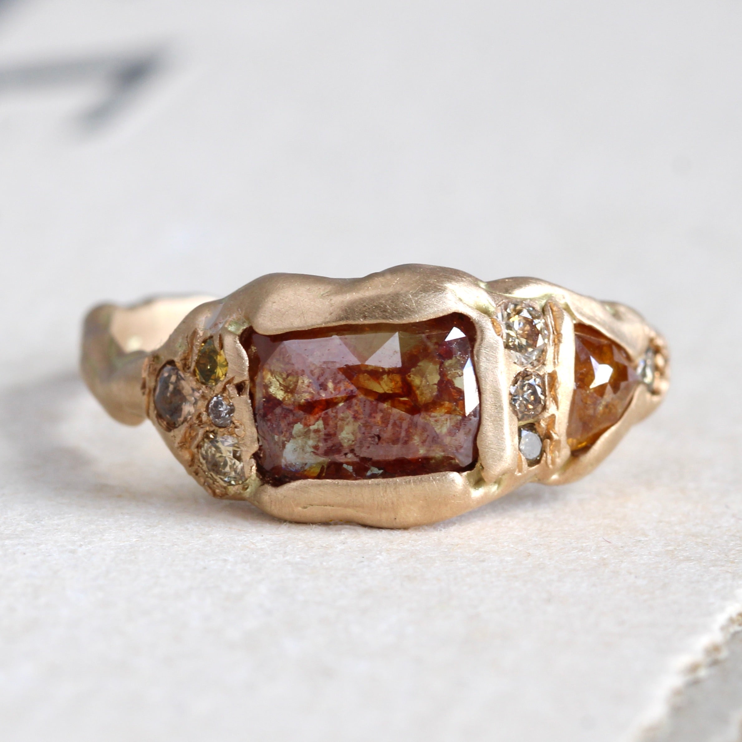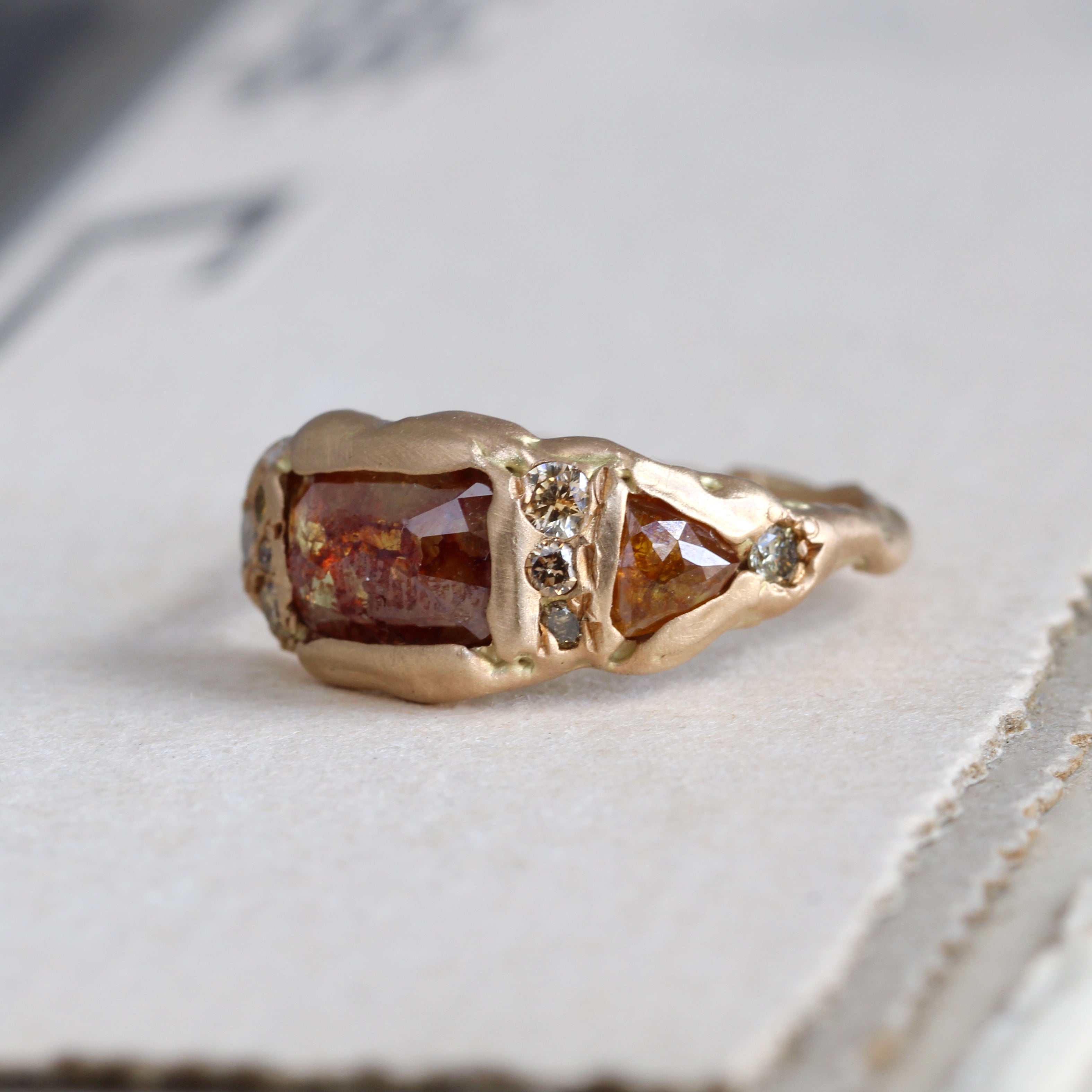 Our handmade rose-cut diamond ring features naturally colored stones custom cut in geometric shapes in a range of glittering earth tones like russet, cinnamon, amber and honey. With the delicate threads of color twining through the stones and an organic woodsy appeal, they're kind of like agate and diamond had a love child.