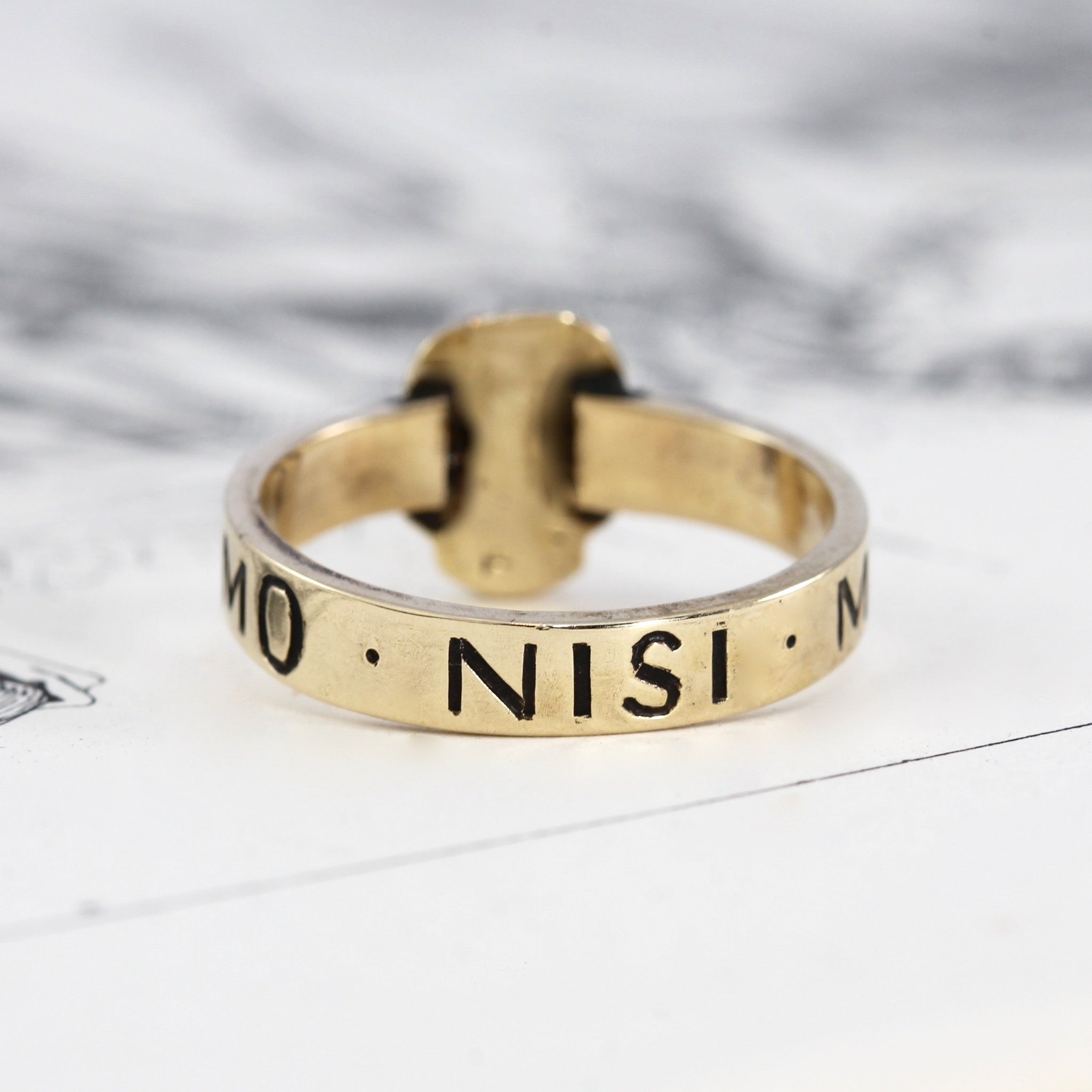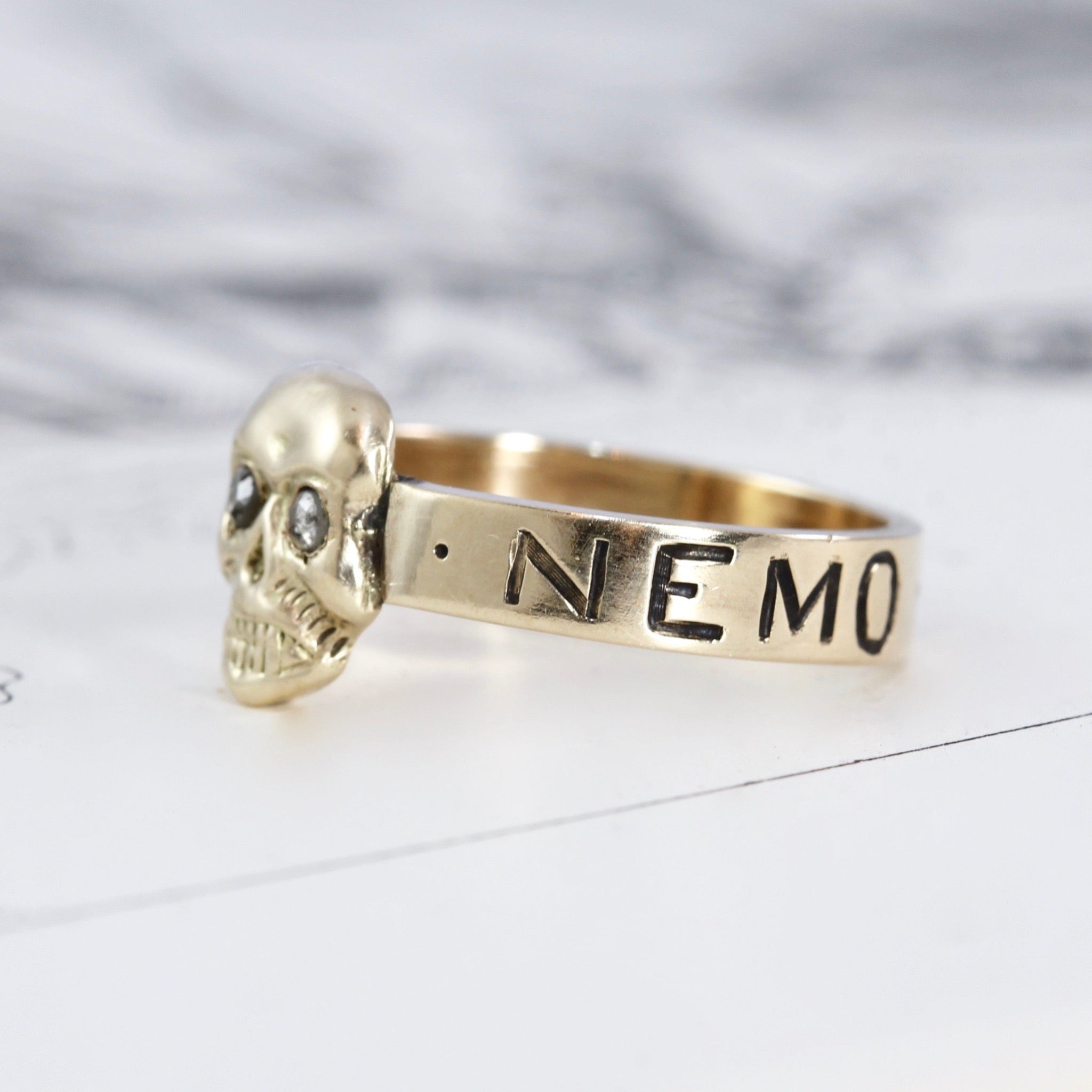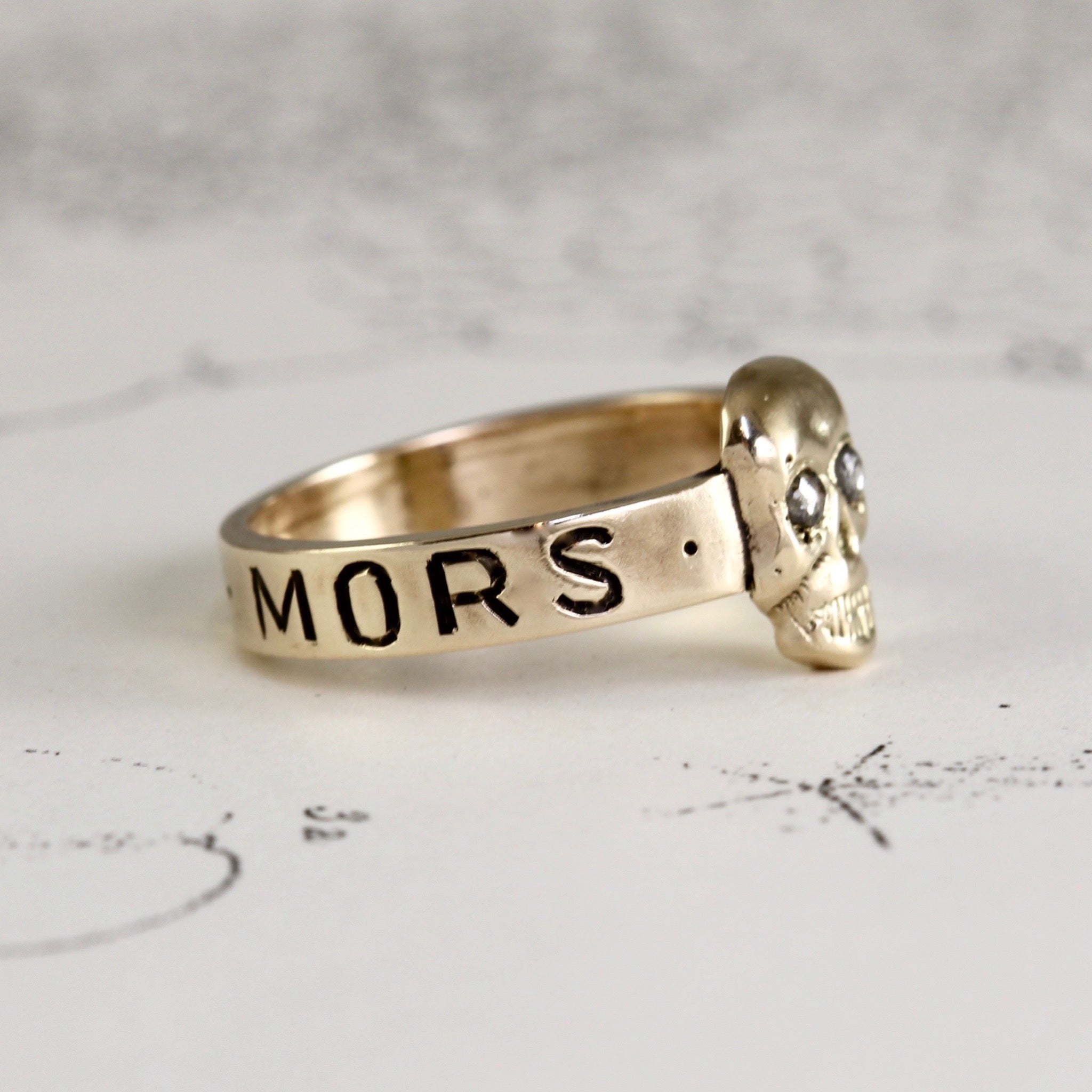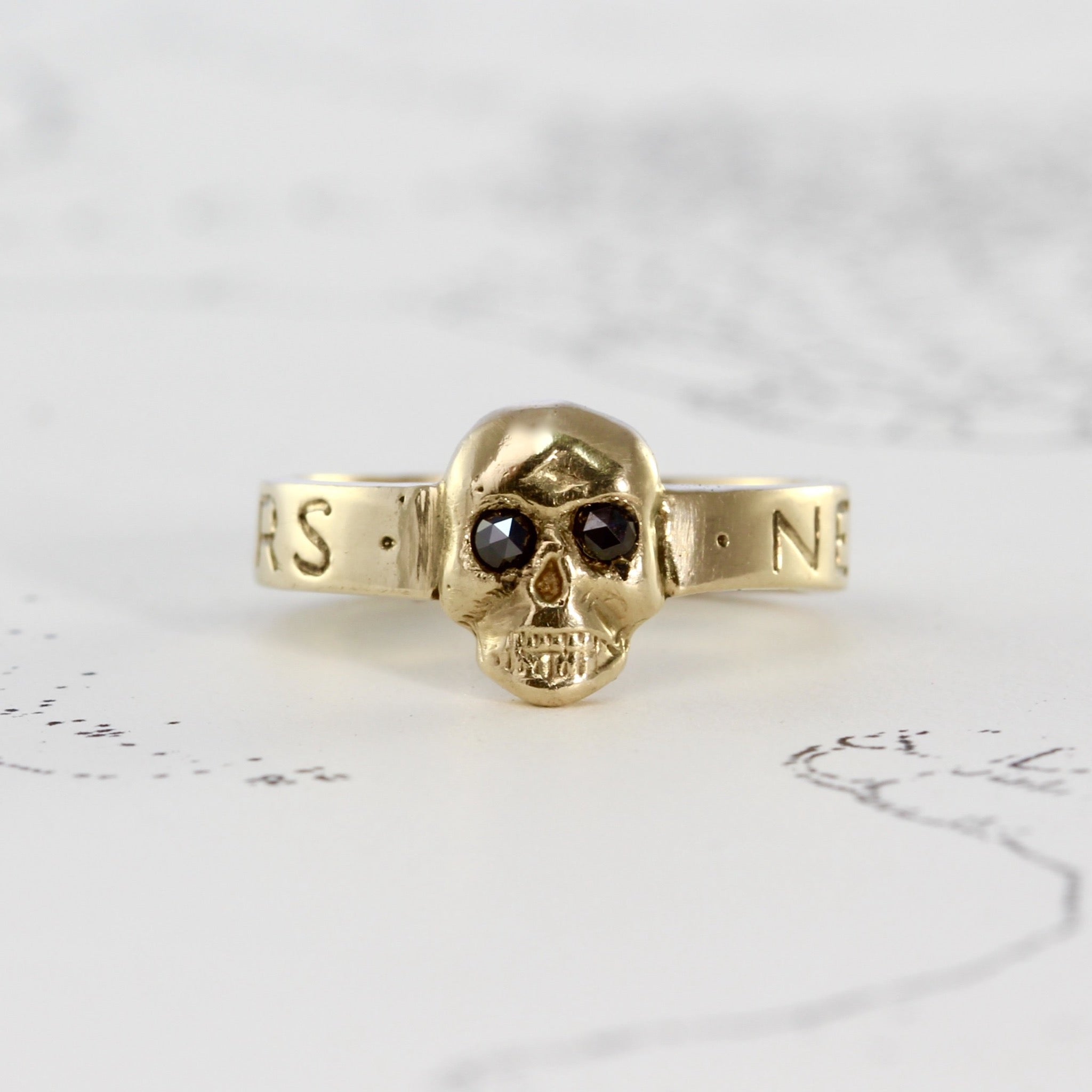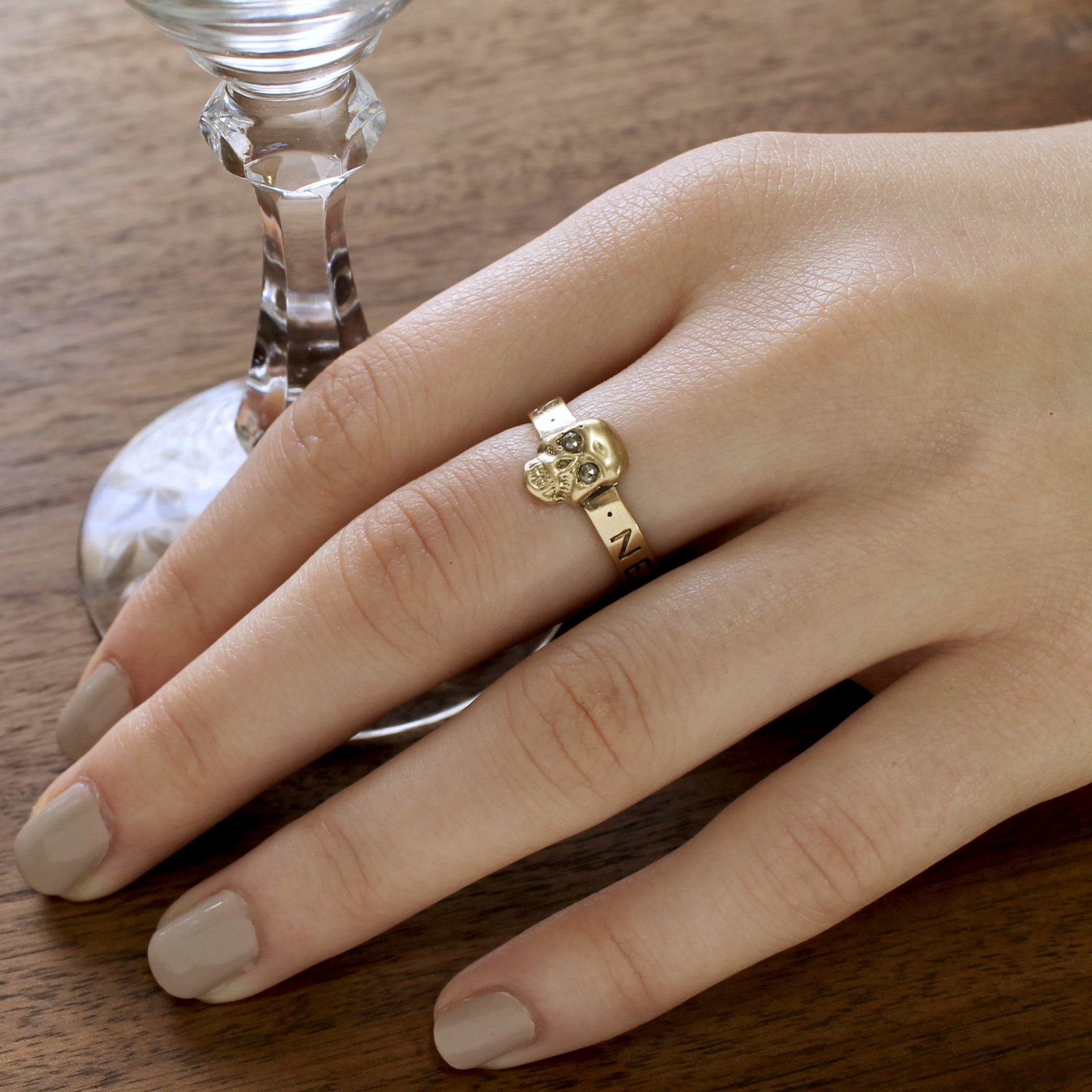 We designed our 14k Memento Mori skull band after antique pieces in our personal collection, engraving around the outside of the band the Latin quote "Nemo Nisi Mors" which translates to "None except death," meaning nothing except death could part the lovers to whom the phrase refers.